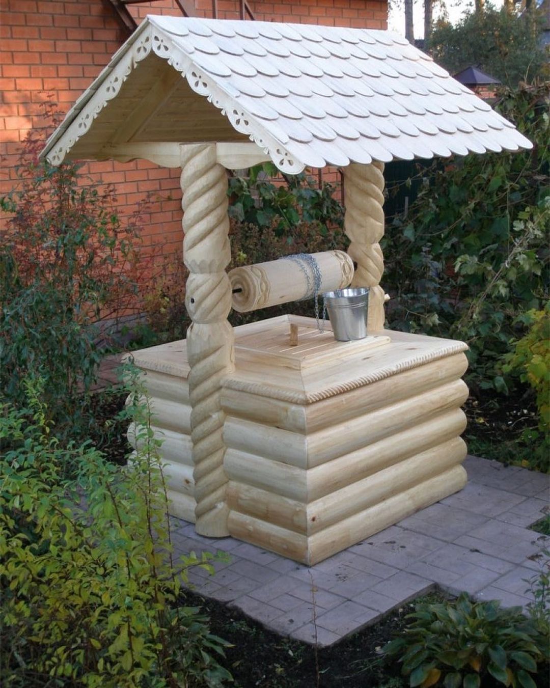 Популярной разновидностью колодезной отделки является резьба: она придаёт сооружению классический вид и хорошо сочетается с оформлением основного дома, если речь идёт о строении из древесины.