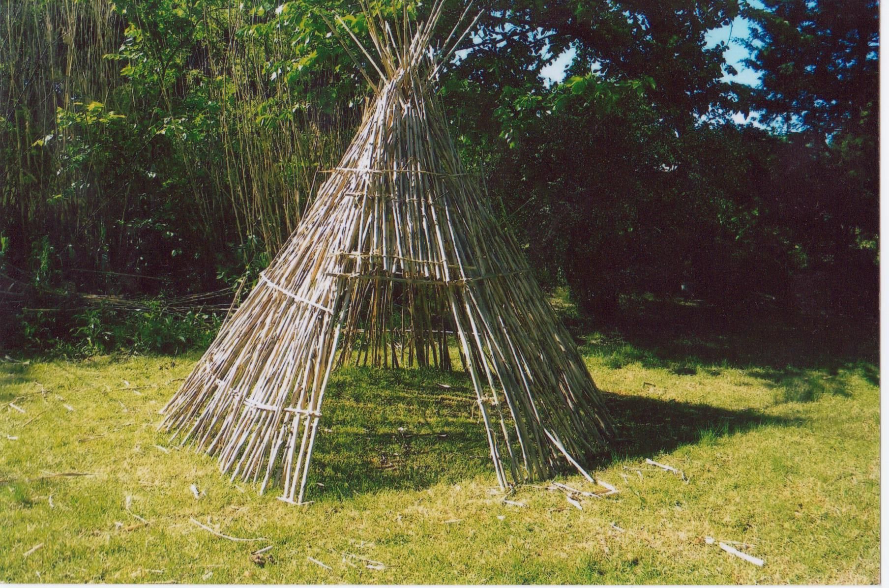 Чтобы соорудить домик типа «вигвам», необходимо возвести каркас с 6 гранями. Важно, чтобы высота конструкции в два раза превышала рост малыша. Такой каркас внешне похож на конус — палки фиксируют по кругу с пересечением в верхней точке. Фиксацию выполняют бечевкой, поочередно связывая элементы остова друг с другом.