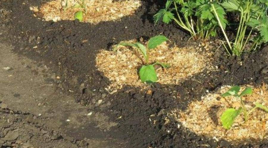 мульчируют опилками для сохранения влаги.Через неделю заметил