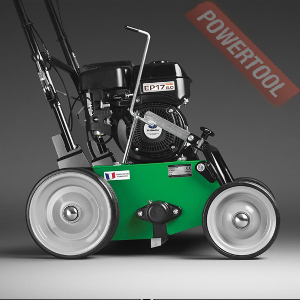 Диски/шины – полимер (спереди 140 мм / сзади 170 мм). - Регулировка глубины реза. 6-ступенчатая регулировка рабочей глубины расположенным на ручке эргономичным блоком управления с оптической индикацией глубины реза, а также рычагом подачи инструмента для опускания рабочего органа аэратора.