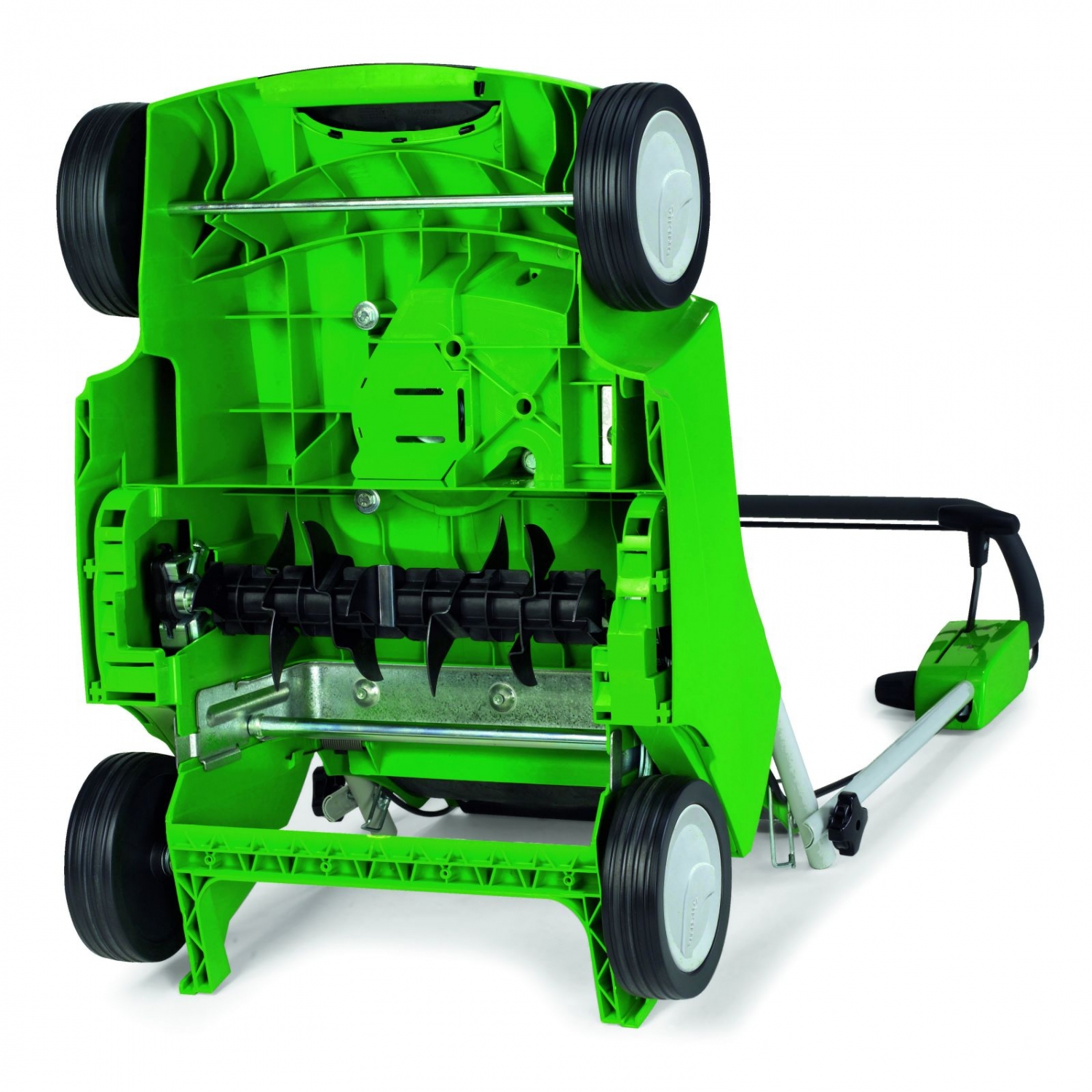 Здесь также установлен электромотор мощностью 1100 Вт, но для обработки земли используются не пружинные лапки, а 14 плоских ножей, размещенных по периметру барабана. Глубина обработки также как и на предыдущей модели регулируется в четырех положениях (+5, 0, -5 и -10), что позволяет выбрать подходящий режим работы или сделать поэтапную аэрацию, если газон давно не обрабатывался. Ножи плавающие, это защищает их от повреждения если аэратор нечаянно наехал на камень.