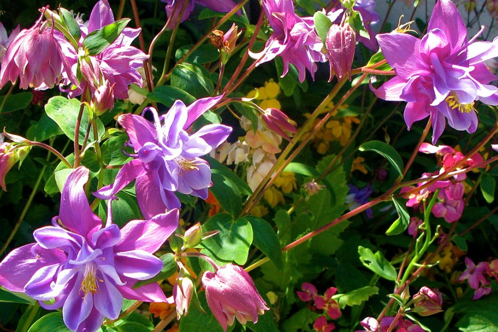 Цветущие в начале лета аквилегии заполняют сезонный промежуток между последними весенними луковицами и первыми летними цветами. Они легко размножаются и прекрасно смотрятся среди кустарников и роз, а также хорошо растут в тени. Однако растения свободно скрещиваются, и сеянцы редко напоминают родителей. Если вы предпочитаете этого избегать, высаживайте мертвые растения после цветения, чтобы предотвратить самосев.