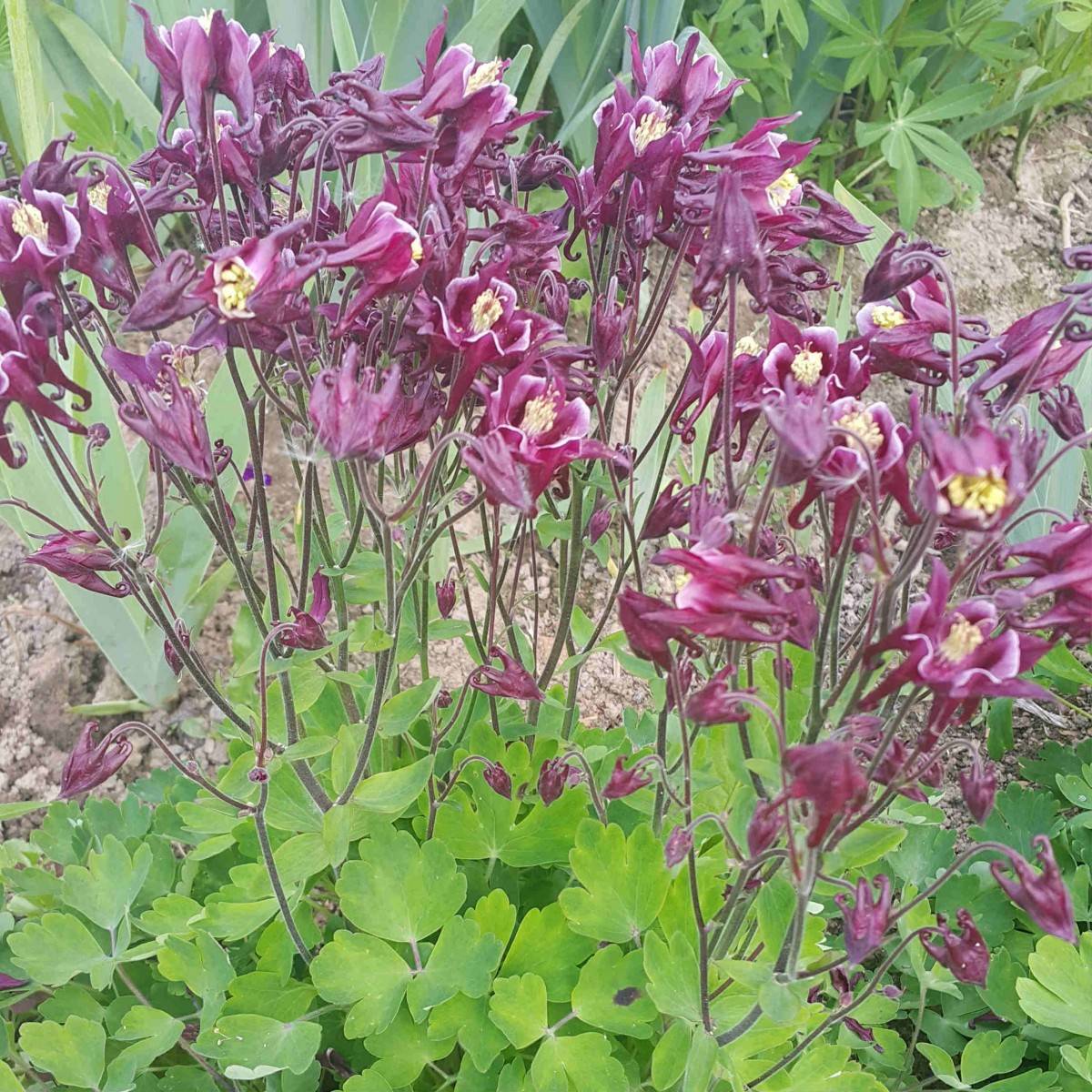 Выше на фото: сорта аквилегии Блэк Барлоу и Нора Барлоу