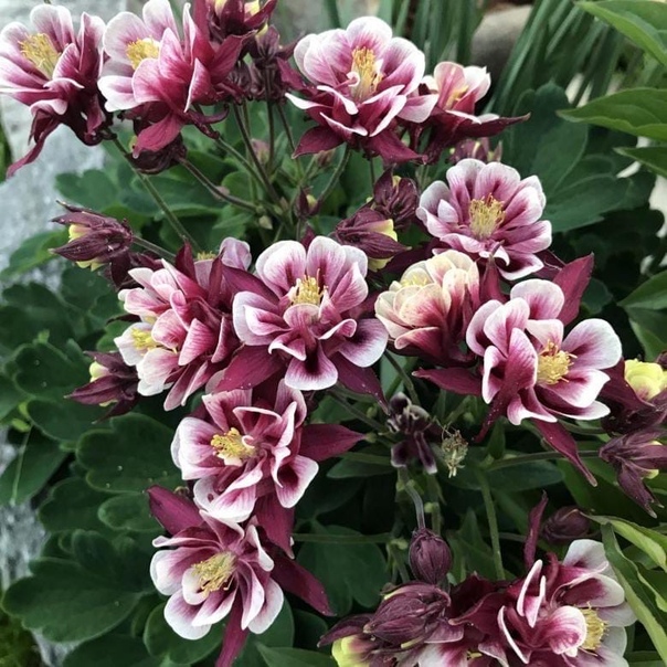 Winky Purple и White Columbine — это эффектные кивущие пурпурные цветы в форме колокольчиков с синим оттенком и белыми центрами на концах стеблей с конца весны до начала лета, которые появляются из характерных темно-фиолетовых цветочных бутонов.