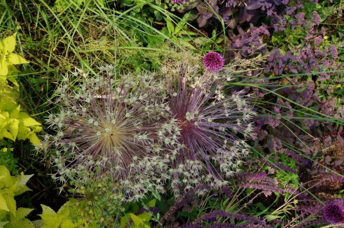 Allium cristophii производит в начале лета поразительные шаровидные фиолетовые звездчатые цветы. Длинные линейные листья отмирают до появления цветков в начале лета.