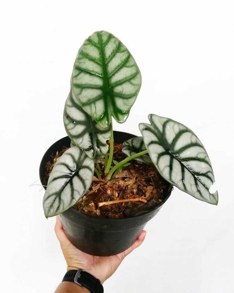 Багинда Серебряного Дракона немного отличается от драконьей чешуи Алоказии. Они имеют более серебристый цвет листьев и обычно дают гораздо больше листьев, чем разновидность чешуи дракона. Листья имеют темно-зеленый и черный эффект затенения, подчеркнутый серебристыми акцентами на внутренней стороне рельефных листьев. Прожилки на листьях ярко выражены и обычно имеют темно-зеленый оттенок, что придает листьям глубину и текстуру. Несмотря на то, что они вырастают довольно высокими и крупными, им не требуется много места в почве для процветания, поскольку их корни не растут очень глубоко. Серебряное растениеСеребряное растение очень декоративно с большими серыми листьями и темными полосами. Достигает высоты 50 см.Научное название:Alocasia nebula- Тип растения: нежный многолетнее время