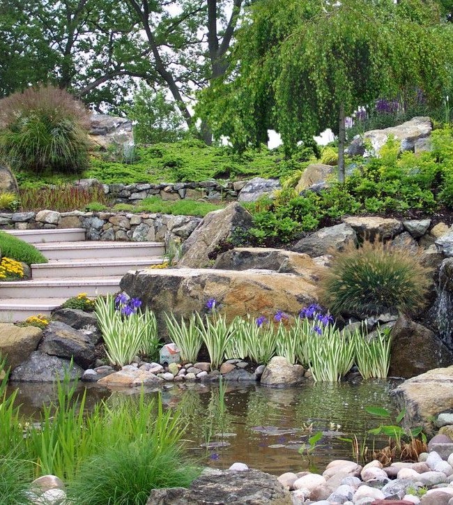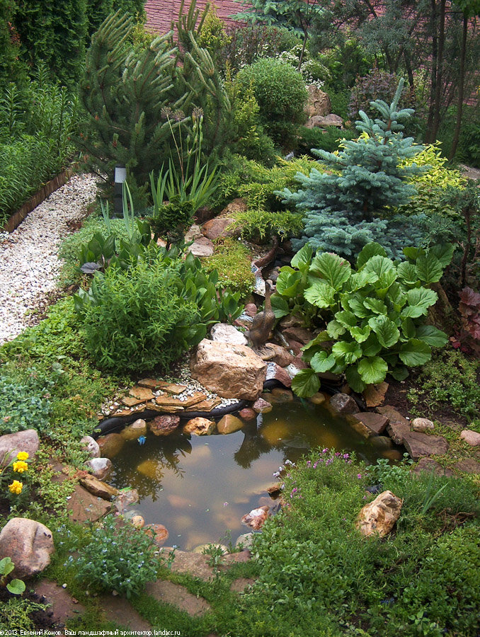7. Альпинарий с прудом. Превосходная композиция, где присутствует маленький водоем у подножья альпийской горки, а по скалистым склонам стекают изящные горные ручейки.