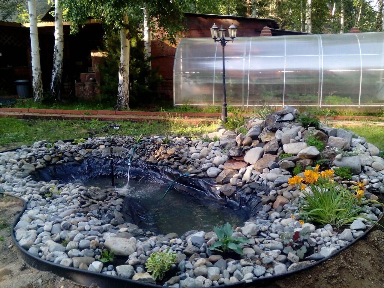 Вокруг пруда вырывают канаву, кладут на кромку геотекстиль и пленку, подвернув их. Углубление засыпают щебнем; - Укрепление окантовки пруда камнем, щебнем либо трубами. Если земля каменистая, то для защиты пленки дно покрывается слоем песка;