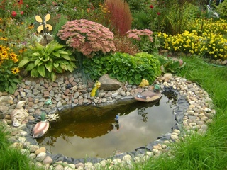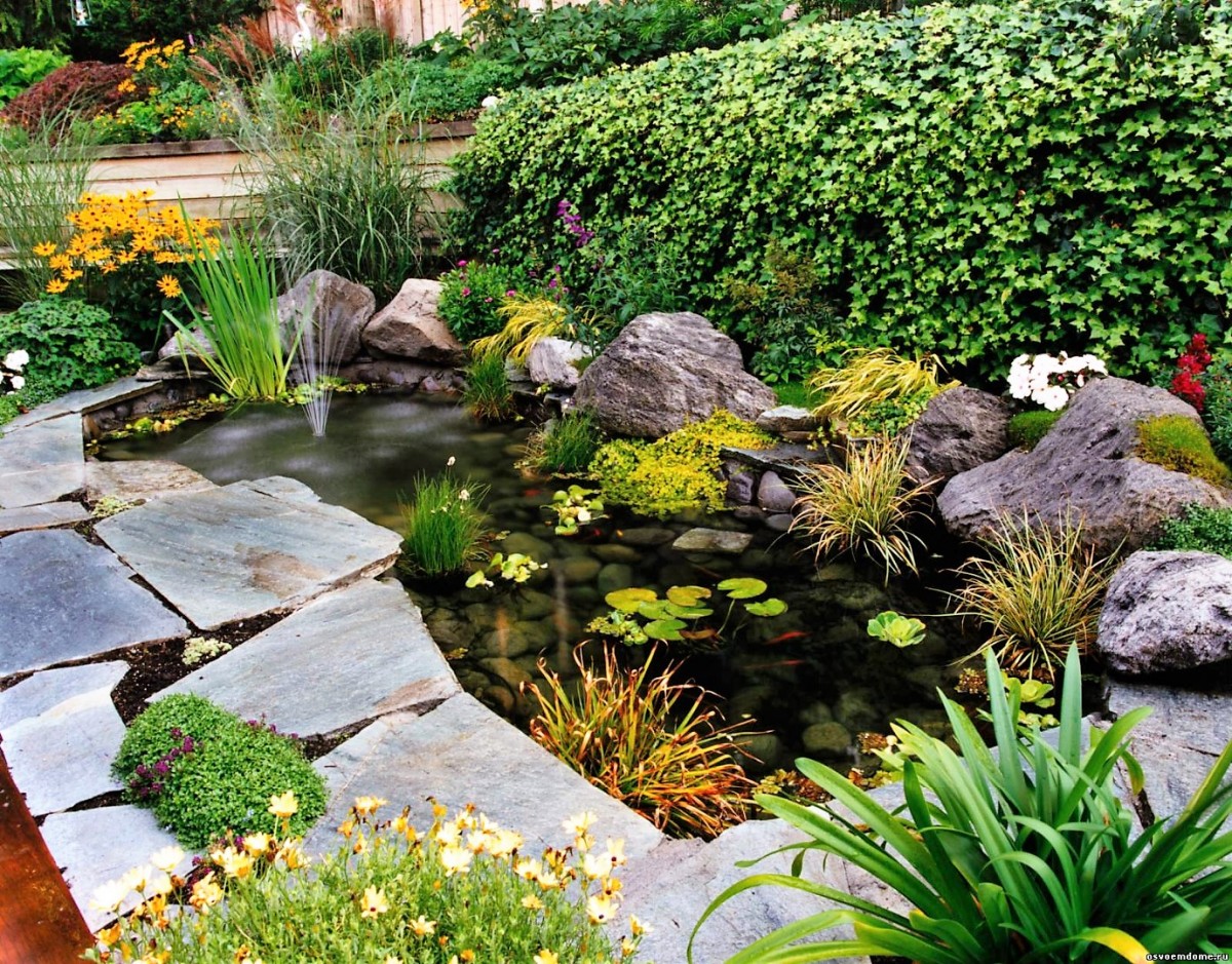 Вокруг можно разместить необычные фигурки из камня, цемента, керамические кувшины и прочие разнообразные детали на ваш вкус.