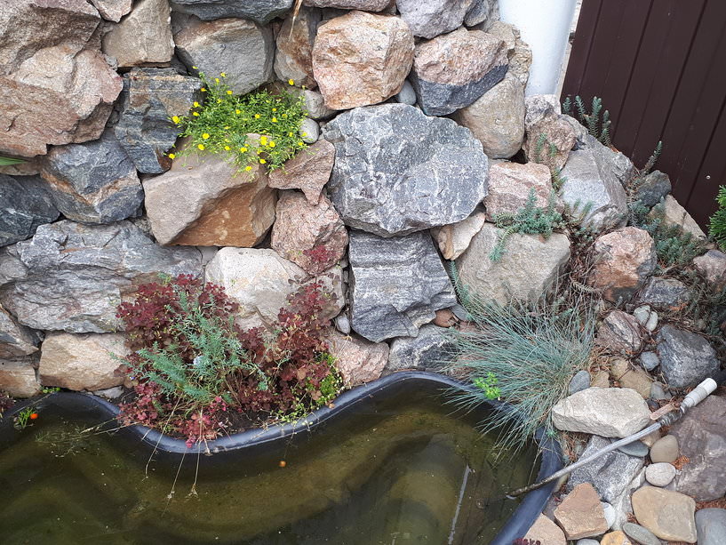 Для этого применяют плоские камни и кокосовые маты, которые сверху закрепляют камнями, а нижний край направляют в пруд. В карманы этого покрытия можно посадить водные растения, маскируя ими стенки водоема. У его краев высаживают свисающие растения. Можно применять также большие камни, коряги и прочие.