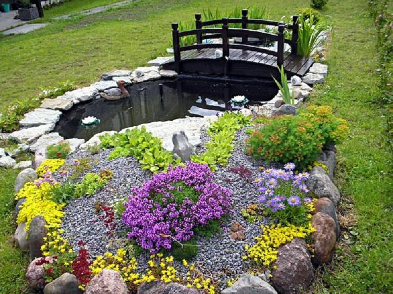 Прудик для альпийской горки может иметь самые разные ландшафтные решения. Его можно украсить мостиком с декоративной водяной мельницей, небольшими гротами. Если вы планируете поместить туда рыбок, то глубина его должна быть не менее 2 метров. В других случаях можно ограничиться метровой глубиной.