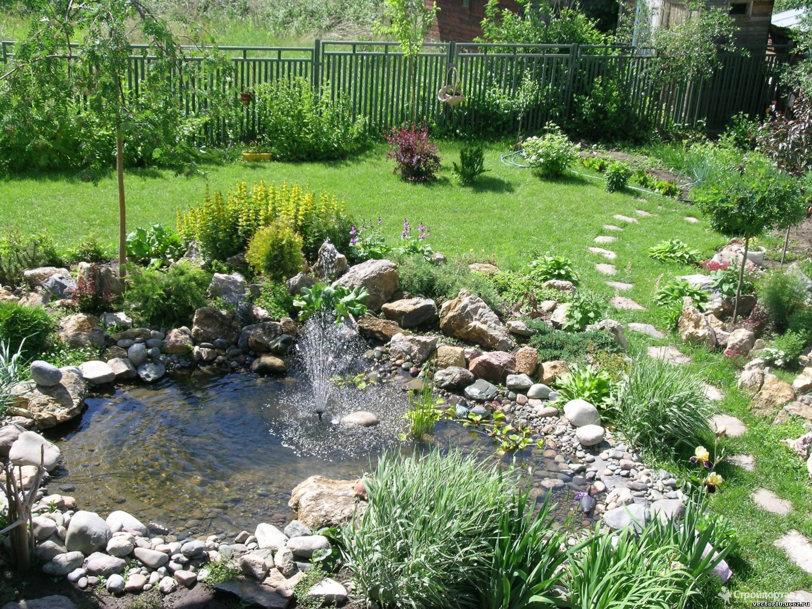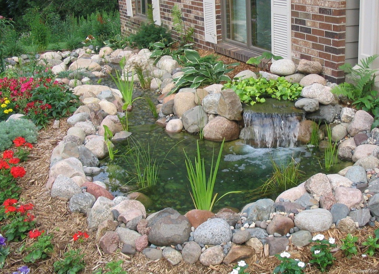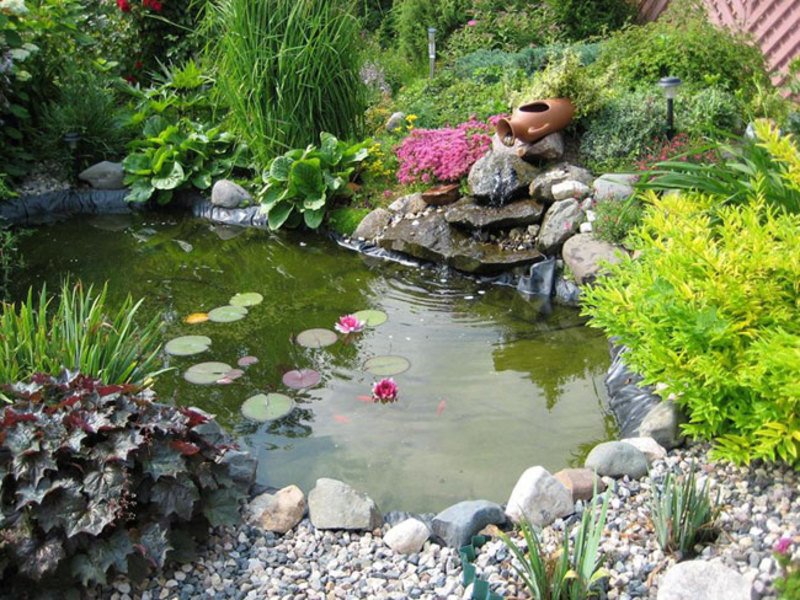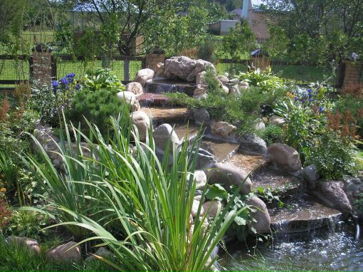 Особым украшением прудика является каскад водопада. Перепад воды создается с помощью насоса. Мощность насоса диктуется высотой водопада. Лучше применять насос, позволяющий регулировать мощность струи. Вода наверх подается с помощью шланга.