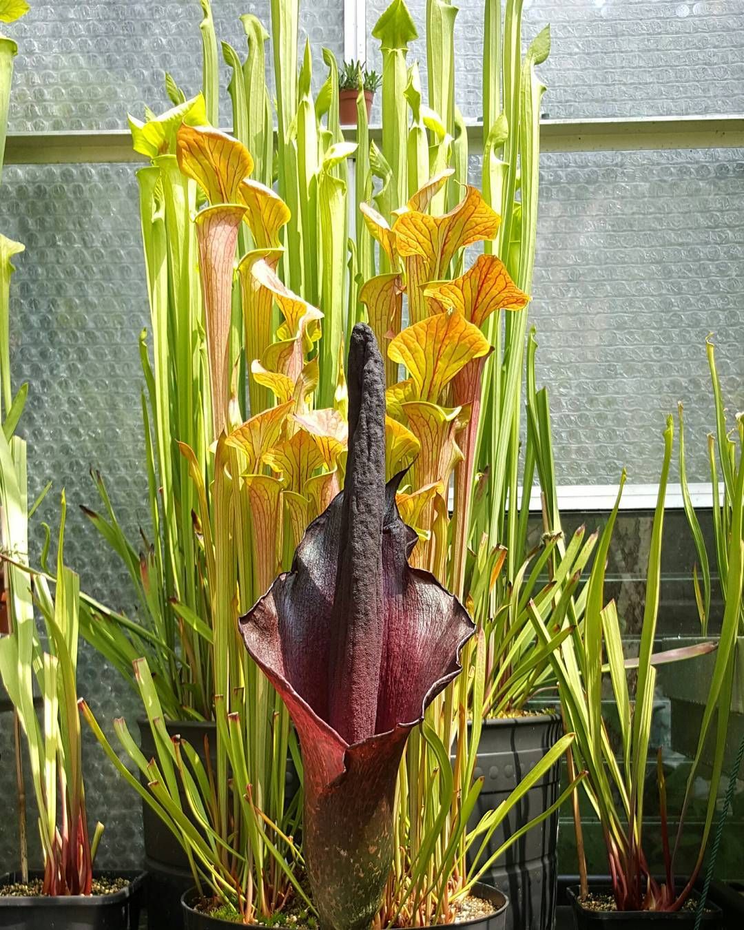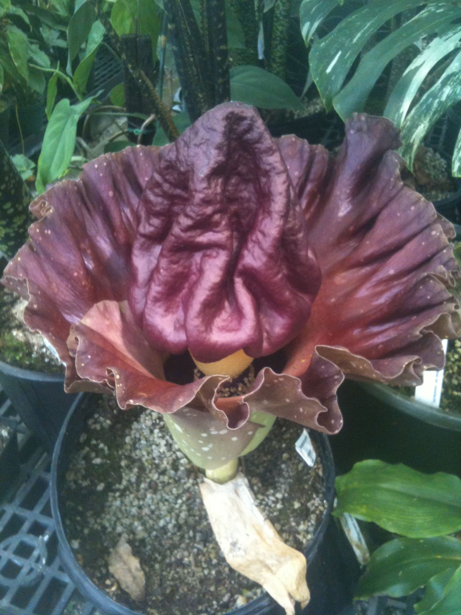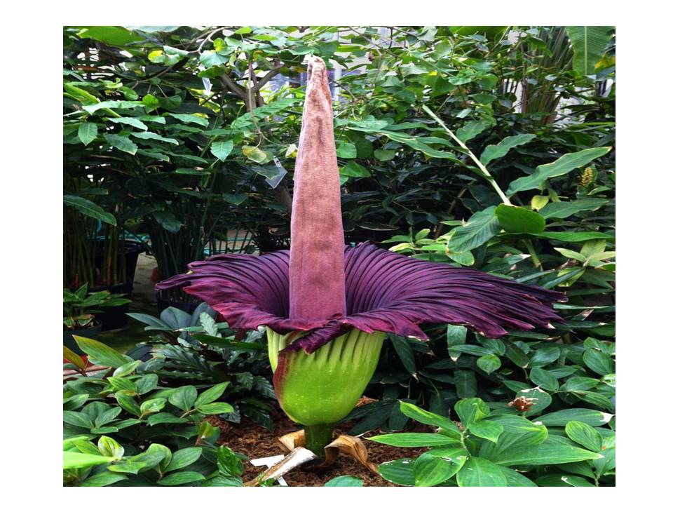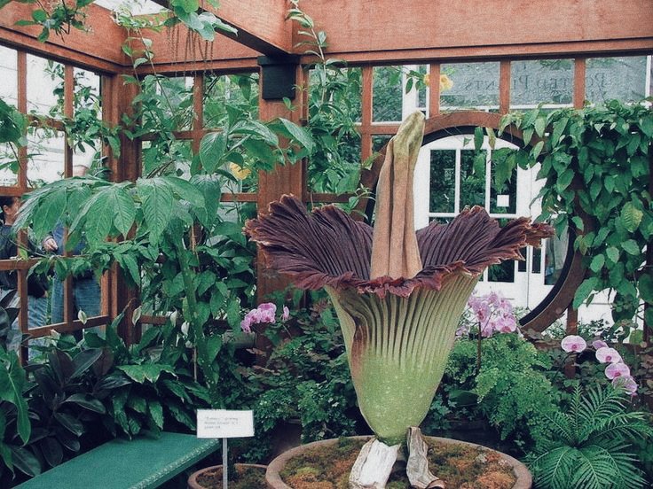 Исчезающий и гигантский вид титана Amorphophallus обычно называют трупным цветком, вонючим растением и титаном Анумом). Он производит самое большое неразветвленное соцветие в царстве растений. Цветы этого вида вырастают до 12 футов в высоту в своих родных тропических лесах Суматры, Индонезия. Во всем мире предпринимаются усилия по сохранению из-за сокращения среды обитания.Известно, что в дикой природе существует только 1000 растений A. Titanium.