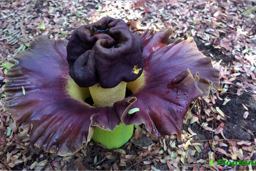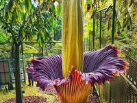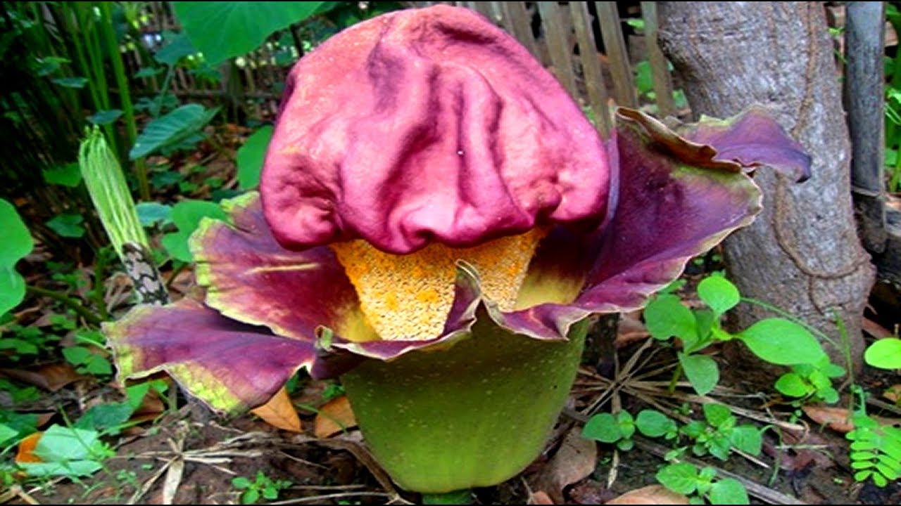 Лепестки такого цветка почти бархатные, кроваво-красного цвета. Что интересно, у этого цветка почти нет видимых листьев или стебля — просто в какой-то момент посреди джунглей вырастает цветок прямо на земле. Однако раффлезия довольно требовательная к климату, и не каждые джунгли ей подходят: на сегодняшний день этот цветок считается довольно редким и встретить его можно только на Борнео в Малайзии и на острове Суматра в Индонезии. Цветы могли бы быть частым гостем в парниках ботанических садов, если бы не их запах — раффлезия источает сильную вонь разлагающейся плоти, именно такой запах привлекает насекомых, которые опыляют этот цветок.Аморфофаллус титанический из Индонезии