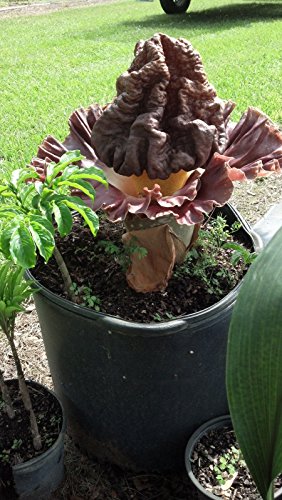Внешне они напоминают небольшую пальму. Черешок листа испещрен привлекательным узором из светло-зеленых пятен. Поверхность черешка галечная и напоминает кожу ящерицы. Соцветие, которое появляется весной раз в два-пять лет, очень большое. Фиолетовое покрывало имеет диаметр 15-24 дюйма и может быть желтого или белого цвета в центре. Кончик початка красновато-фиолетовый, выпуклый и складчатый, создавая впечатление мозга. Лист выращивают с использованием углеводов, хранящихся в клубне.Клубень полностью израсходован в этом процессе. В течение вегетационного периода под растением начинает формироваться новый клубень, в котором запасаются ресурсы, полученные листом и корнями, для использования при выращивании листа или соцветия следующей весной. Для более крупных растений клубни могут весить до двадцати фунтов.