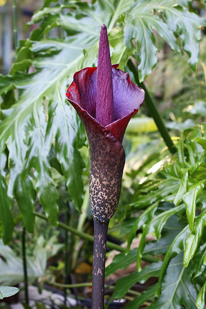 Amorphophallus paeoniifolius, Аморфофаллус пионолистный, «Цветок дьявола», «Лилия Вуду» — одно из самых оригинальных и противоречивых комнатных растений: необыкновенно красивый крупный цветок, великолепный огромный лист и при всем при этом довольно специфический аромат. Семейство Ароидные, растет в некоторых провинциях Китая, во Вьетнаме и на островах Тихого океана.