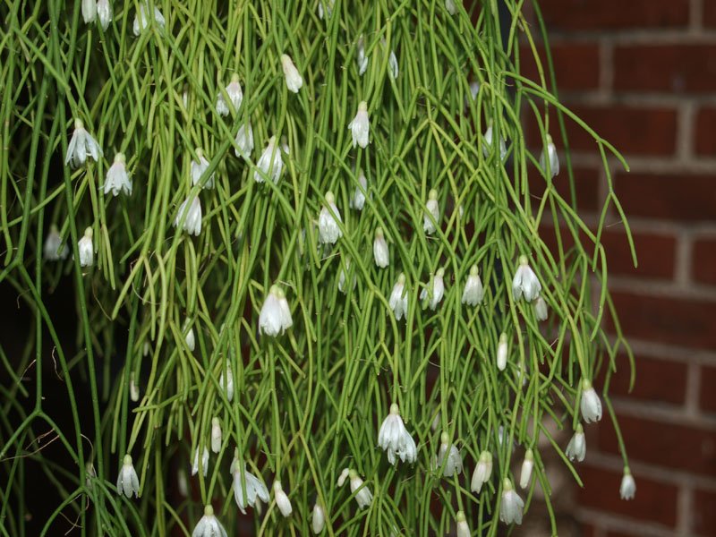Оригинальный эпифитный кустарник с палочковидной зеленью. Его тонкие, сочные, густо ветвящиеся, округлые побеги образуют причудливые поникающие графические кусты, вытягиваясь до 2-х м в длину. На концах «палочек»-ответвлений слегка приоткрываются мелкие белые цветки с полупрозрачными лепестками.