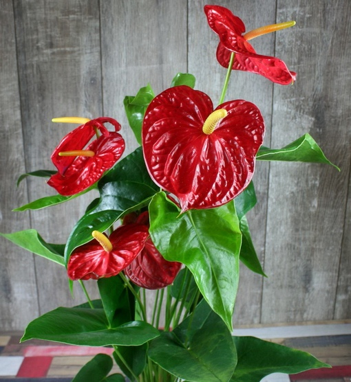 Цветки фламинго рождаются на длинных стеблях, которые гордо возвышаются над блестящей зеленой листвой.Цветы будут храниться несколько недель, прежде чем они увянут и опадут с растения.