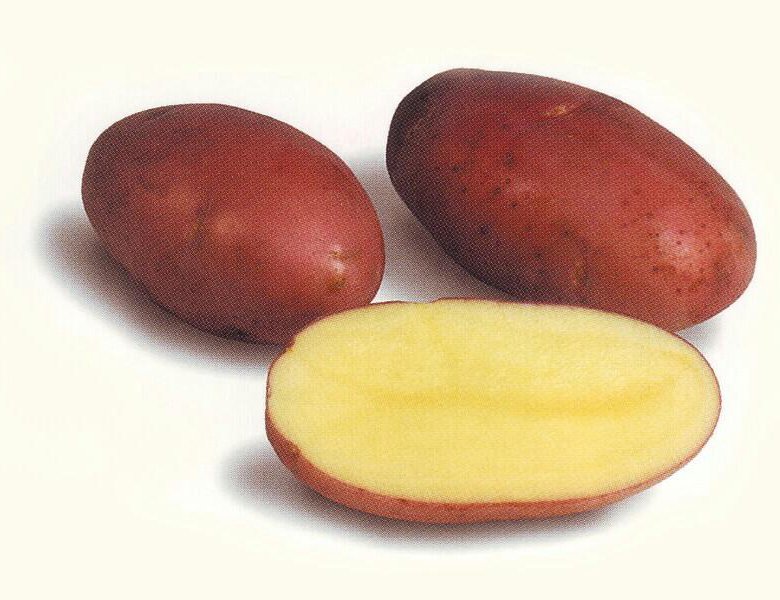 - Клубень овальный. Кожура красная. Мякоть желтая.