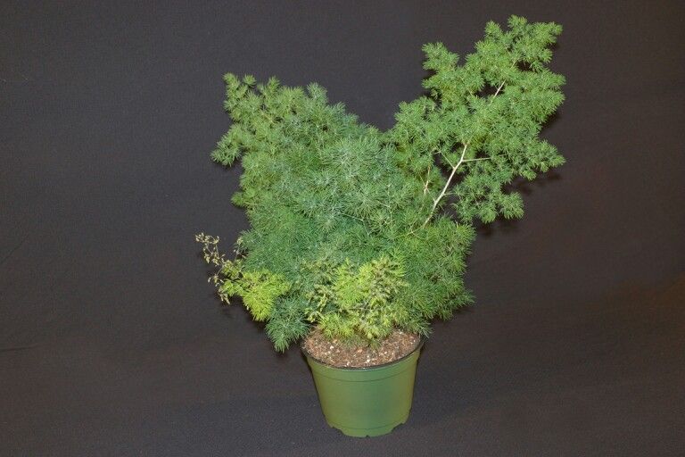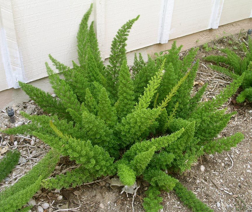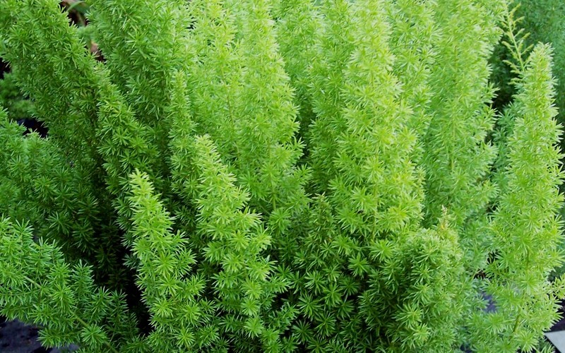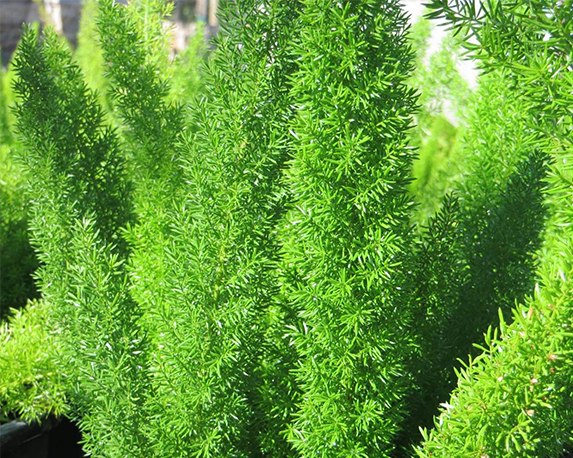 Аспарагус пирамидальный. Побеги на кустарнике высотой 50-150 см растут вертикально. Они густо покрыты короткими темно-зелеными филлокладиями, которые расположены в одной плоскости. Хотя на ощупь листочки такие же мягкие, издалека их можно принять за можжевельник.