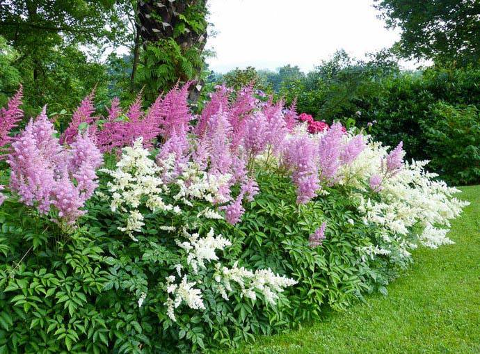 В высоту растение бывает разной высоты от 15 см до 2 м. Корневища плотные стебли прямостоячие, листья, как правило, многоперистые на высоких черешках. Цветки мелкие, собранные в метелки, самых разных, порой очень ярких расцветок. Метелки эти очень пушистые и в длину бывают до 60 см. На цветоножке нет листьев. Цветет этот «пушистик» с начала июня до конца июля, образуя порой целые облака цветов. Не стоит даже напоминать, что сильный аромат цветов растения привлекают в сад множество опыляющих цветы насекомых. Потому многие садоводы высаживают растение в тени плодовых деревьев, только не совсем под ними. Плодовые деревья высокорослым сортам астильбы будут мешать. Само же растение является чудесным медоносом. По этой причине его нередко высаживают на пасеках. Этот многолетник настолько понравился своей неприхотливостью в уходе, что ими выведено более чем двести сортов этого растения.