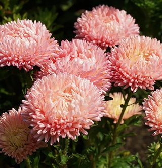 - Пионовидная. Один из самых красивых видов астр. Отличается пышными крупными соцветиями, сохраняет декоративность до самых заморозков. На среднерослом колоновидном кусте 40-70 см высотой эффектно смотрятся белые, розовые, фиолетовые, сиреневые, бордовые, желтые соцветия до 15 см в диаметре. Цветки имеют форму пиона, не уступают ему в декоративности.