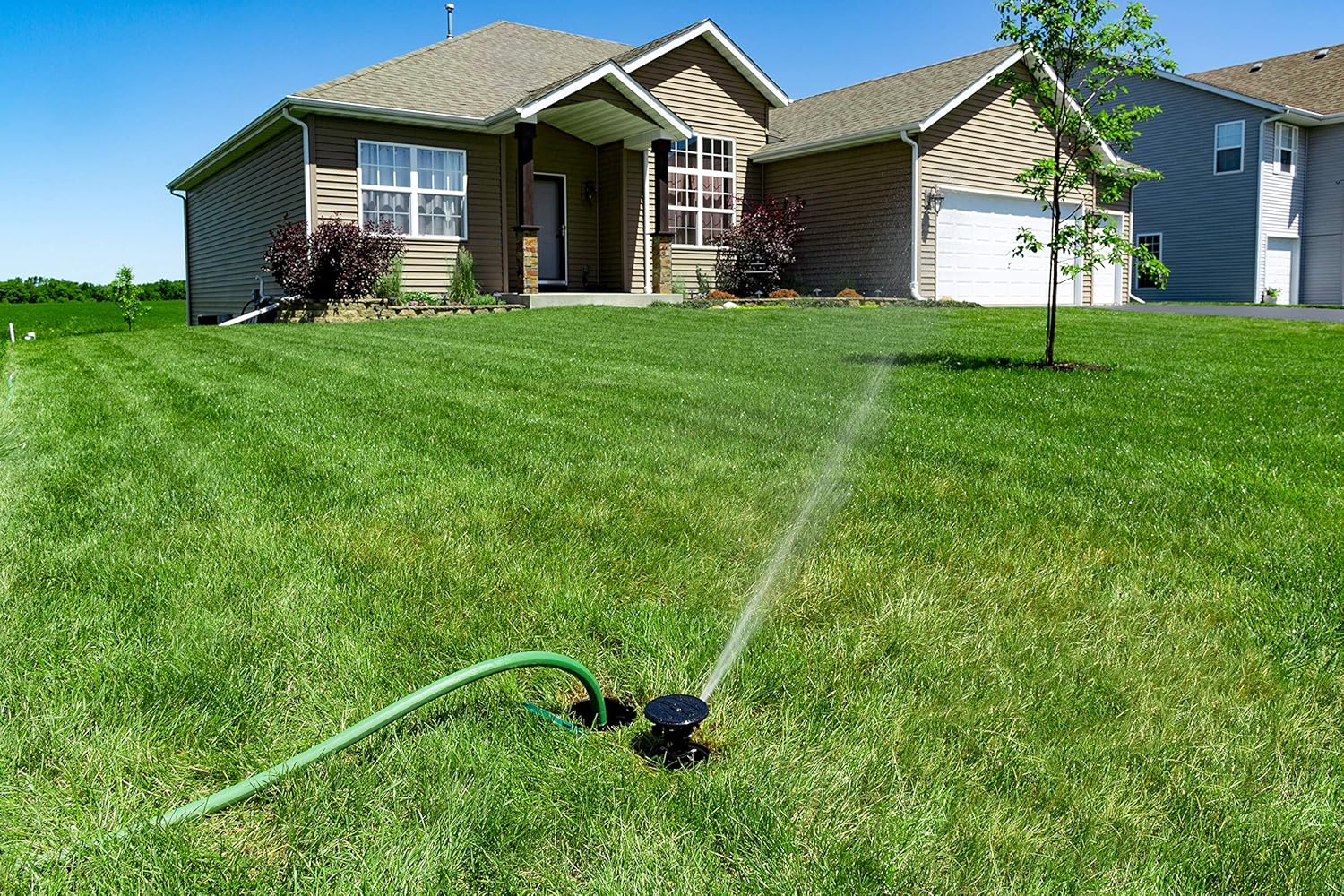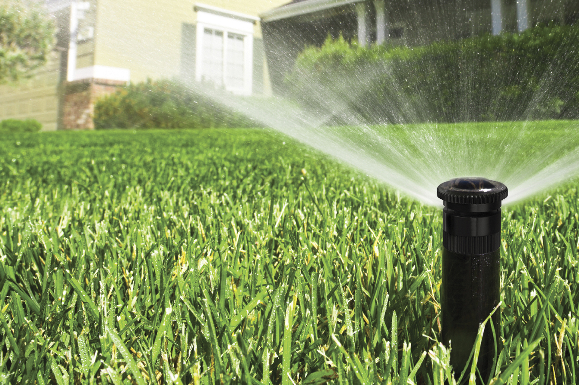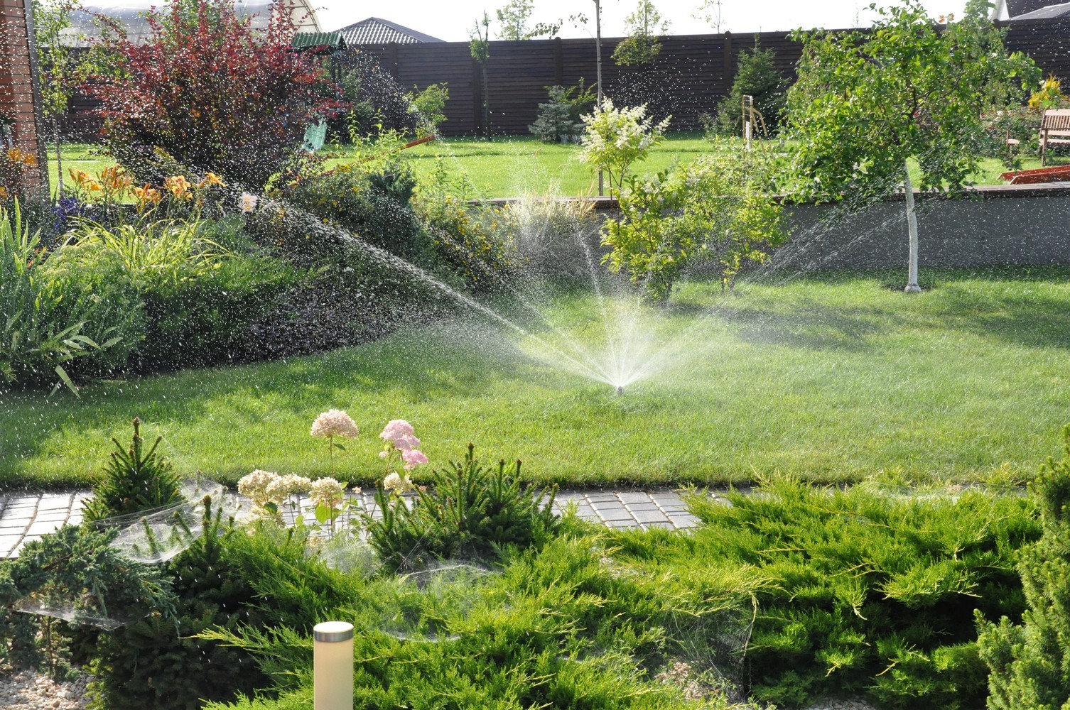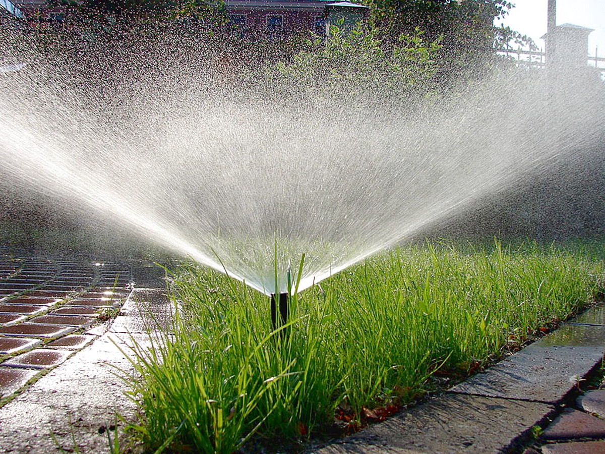Вся территория газона (полив видно на фото) перекрывается спринклерами.