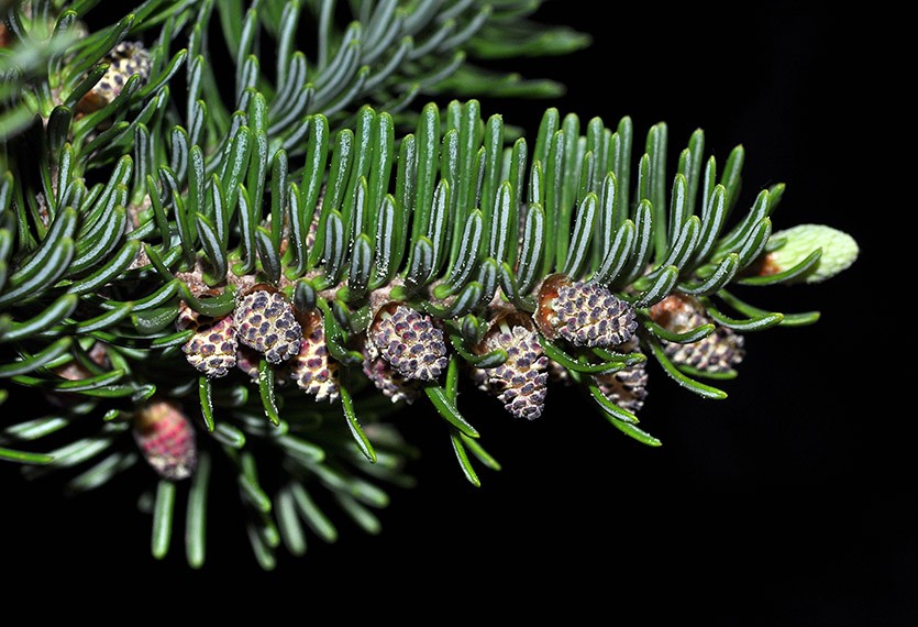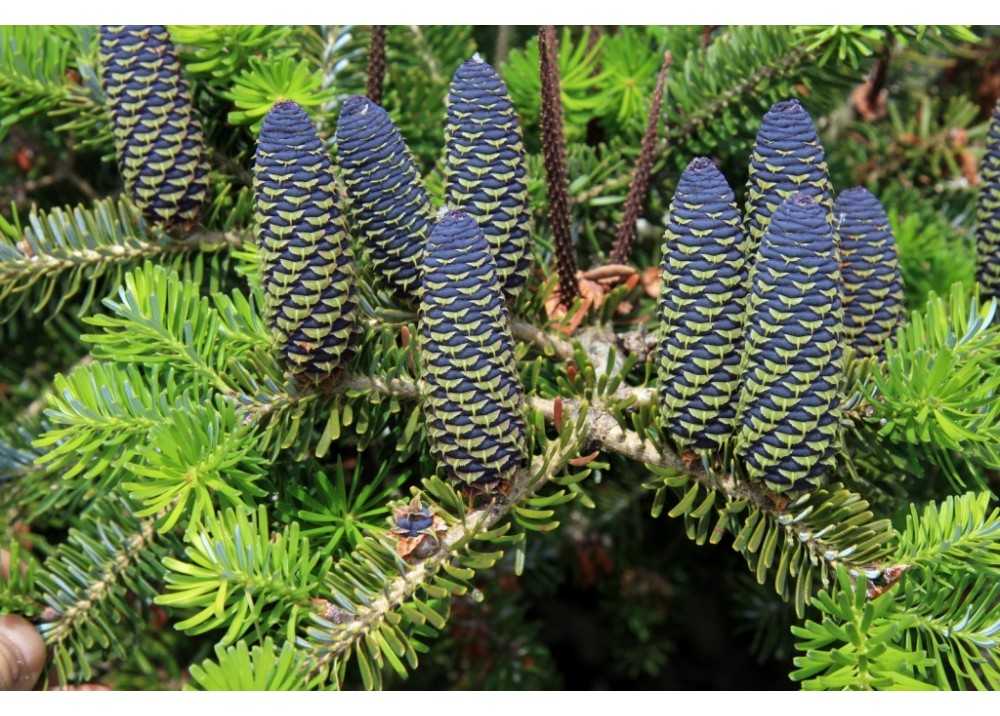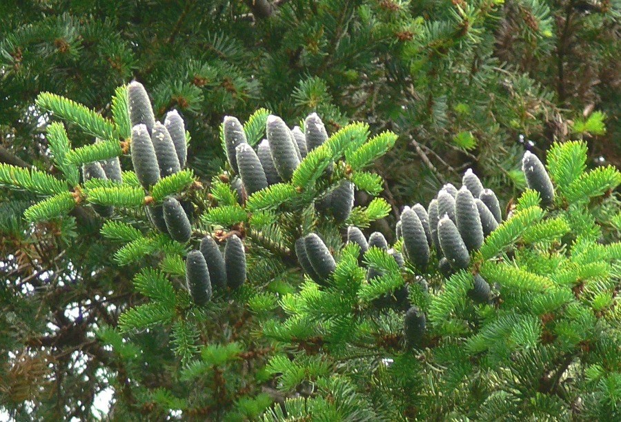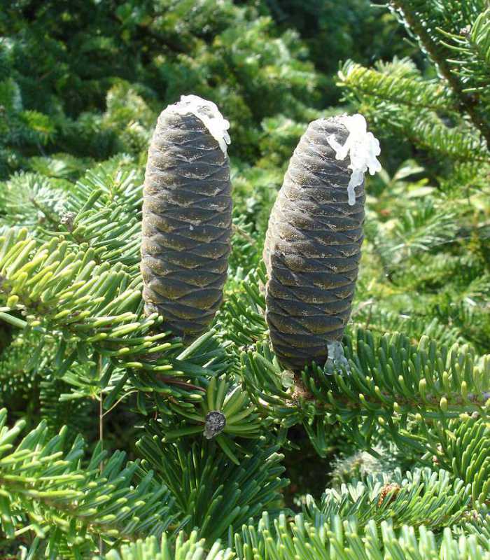 - Шишки у бальзамической пихты растут вертикально, макушки направлены вверх. Формируются на концах побегов, в начале роста они темно-фиолетового цвета, созревшие приобретают коричневую окраску.