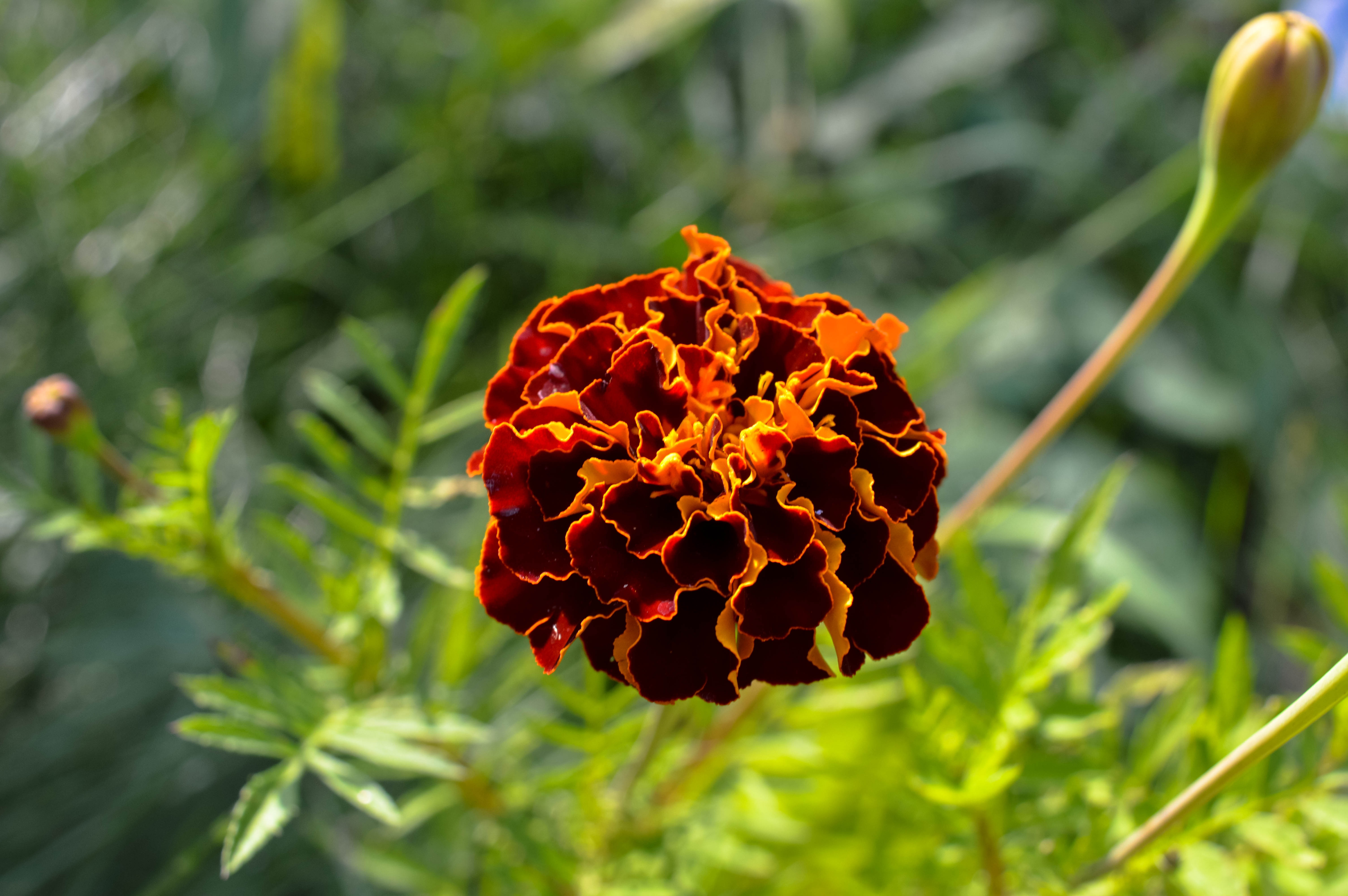Бархатцы – цветущие растения с травянистыми побегами и хорошо развитым стержневым или мочковатым корневищем. Вся подземная часть гладкая, белесая. Плотный прямостоячий стебель с боковыми ответвлениями вырастает на 20-120 см в высоту. Вскоре после прорастания образуется кустарник. Поверхность побега ребристая, тёмно-зелёная или бордовая.