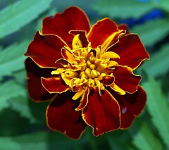 Бархатцы отклонённые (французские). Более компактные растения благодаря сильно разветвленным побегам образуют шаровидный куст 20-50 см в диаметре.