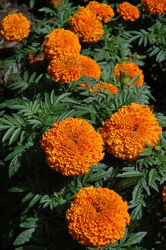 У этого растения высота всего 20 см, кусты густые с прочными побегами, листва тёмно-зелёного оттенка. Цветы махровые напоминающие хризантему около 4 см в диаметре. Эти бархатцы зацветают рано с начало июня, обильное цветение длиться до первых морозов. Сорт подходит для выращивания в горшках, на балконах, клумбах и рабатках.
