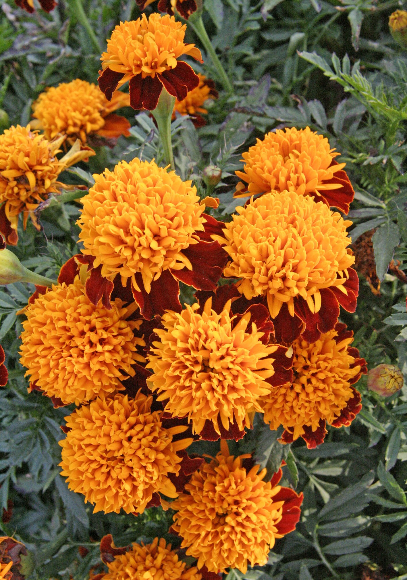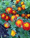Цветы не крупные, пышные, оттенок красный с коричневым и небольшим вкраплением лимонного цвета. Кустики не высокие около 30 см. Эти бархатки быстро идут в рост, цветут много на протяжении всего летнего сезона.