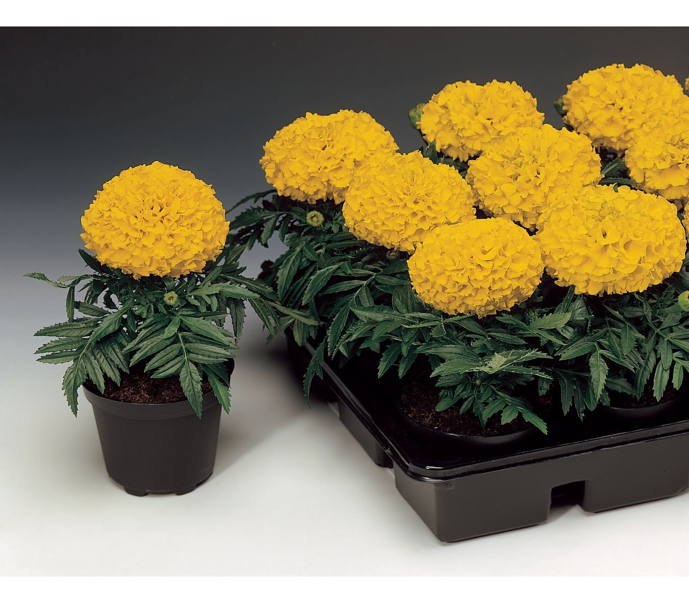 Низкорослые крупноцветковые сорта определяются мощными стеблями, тёмно-зелёной листвой, большими махровыми соцветиями. Окраска цветов может быть лимонной, жёлтой, оранжевой.