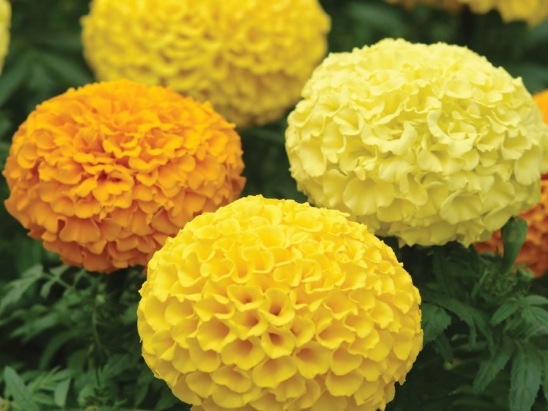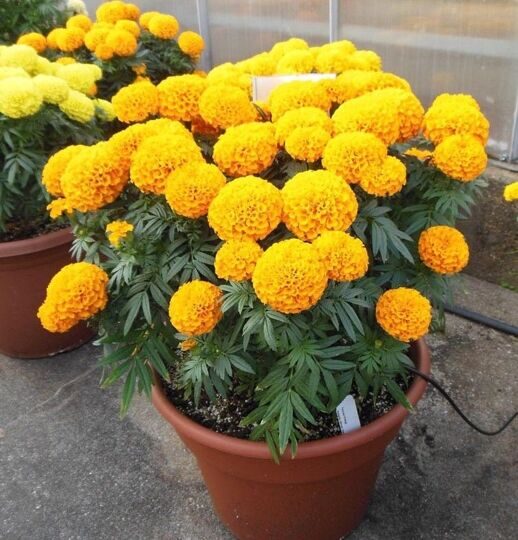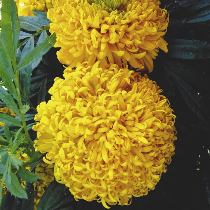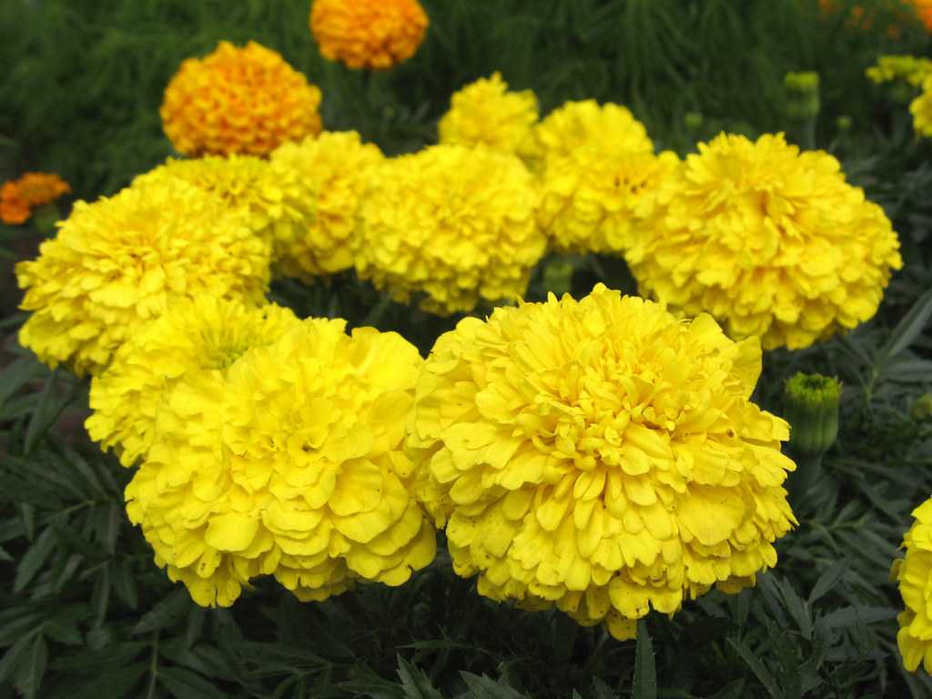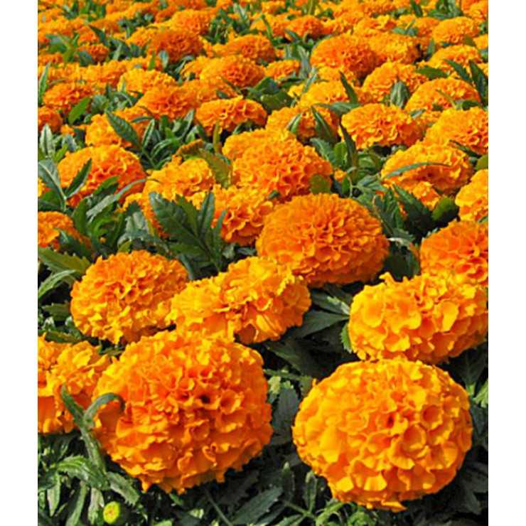 Бархатцы с крупными цветками (Tagetes erecta) представляют собой прямостоячие растения, вырастающие примерно до 24 дюймов (60 см) в высоту, с крупными гофрированными цветами желтого и оранжевого цветов. Иногда их называют африканскими или американскими ноготками, эти тяжелые шаровары могут показаться несколько неуклюжими в летнем саду, но осенью горящие цветные шары доставляют визуальное удовольствие.