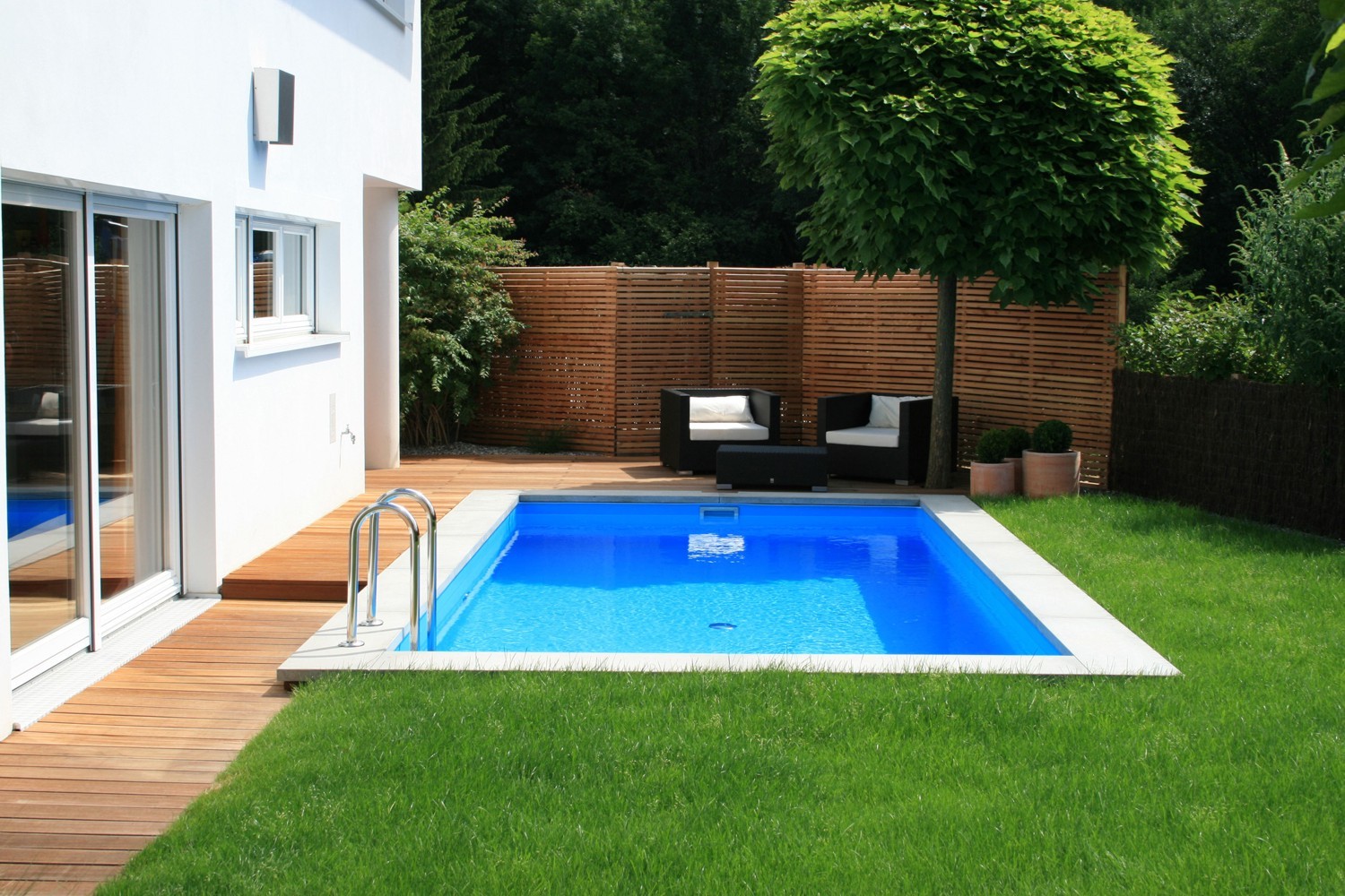Керамогранит поможет сделать привлекательным такой бассейн изнутри, а если соорудить опалубку из дерева, от которой отвести ступеньки и под ними сделать место для переодевания, то конструкция превратится в самый настоящий шедевр.