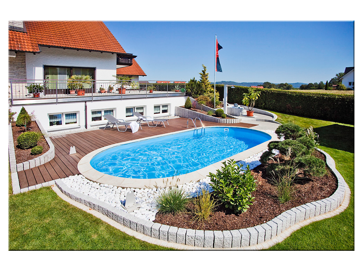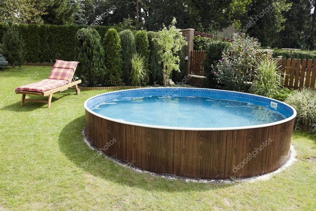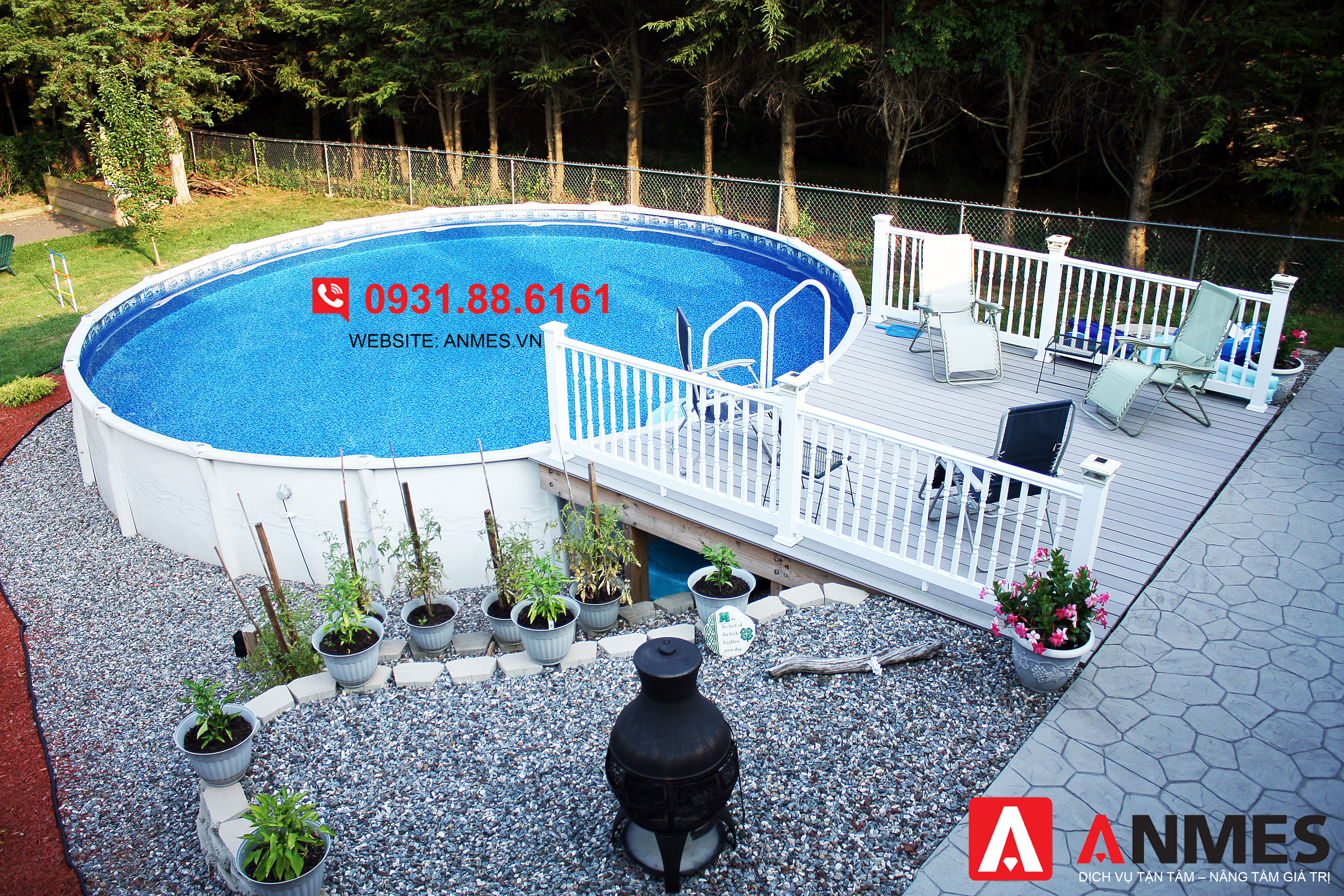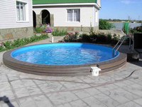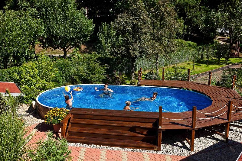 Стационарный каркасный бассейн, окруженный специальным деревянным помостом