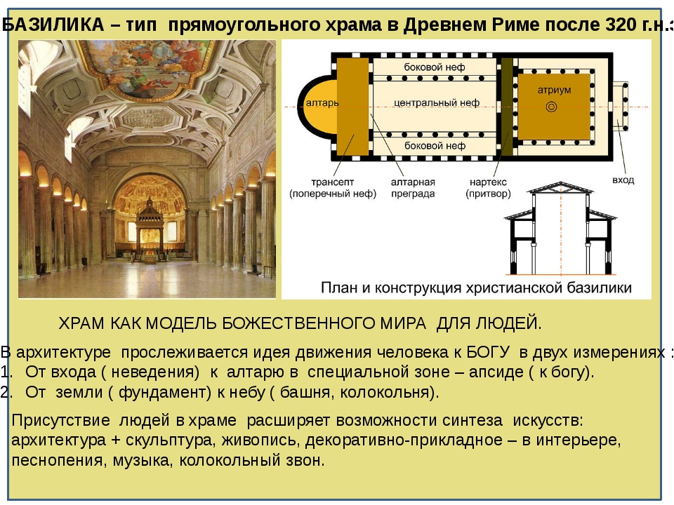 В Древнем Риме базилики – гражданские здания для торговли, судопроизводства и политических собраний, часто размещавшиеся на Форумах. В центральном нефе располагался зал заседаний, в одном из концов которого в полукруглой апсиде, иногда отделенной от остального зла колоннадой, возвышался трибунал с местами для судейских чиновников, адвокатов. Среднее, более высокое, место принадлежало квестору или претору. Перед апсидой находился алтарь для жертвоприношений. Алтарь (лат. altaria, altus – высокий) – жертвенник, поднятый на высокий, украшенный скульптурой цоколь. Вход устраивался с торца или через боковой неф.