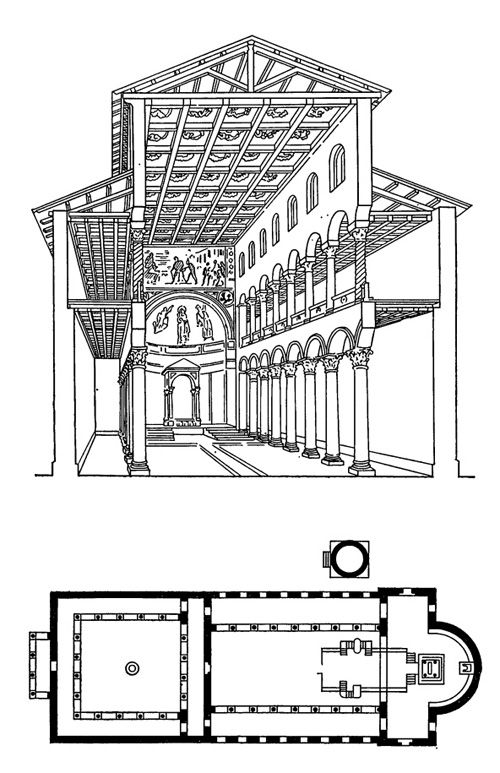 Основной план прежней базилики остался неизменным: длинная комната, разделенная продольно двумя рядами колонн на три корабля, из которых средняя, нефа, большая ширина и через нишу алтаря (Трибуна, Апси, Абсида или Конча). Ней не только шире, но и поднимается на более значительную высоту, чем проходы; окна, встроенные в боковые стенки центрального нефа, обеспечивают его экспозицию. Входная зона часто снабжалась крыльцом, портиком.