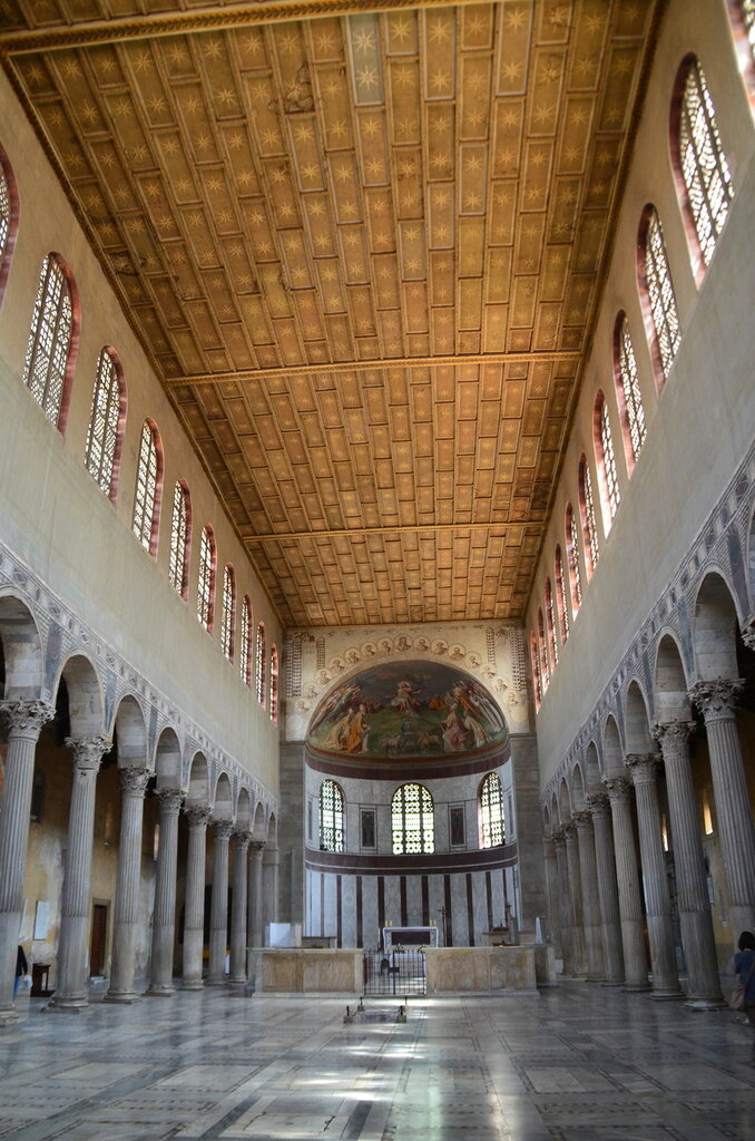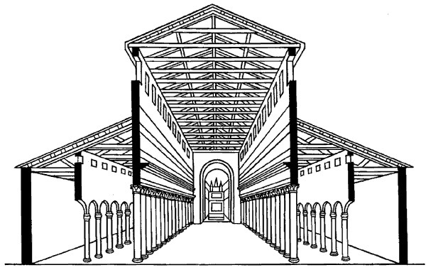 Один тип светской базилики меньшего размера имел боковые нефы, простирающиеся только по длине сторон, и апсиду на одном конце.Именно этот тип использовали первые христиане для своих церквей, возможно потому, что подобные залы в больших частных домах использовались для христианского богослужения до того, как религия была официально признана римским императором Константином в 313 году. Константин сам заказал строительство трех огромных христианских храмов. базилики в Риме: Собор Святого Петра, Сан Паоло Фуори ле Мура и Сан Джованни ин Латерано.