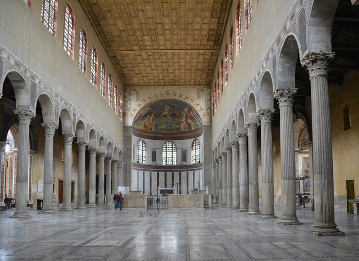 В отличие от своих языческих предшественников, раннехристианские зодчие делали упор на продольной вытянутости базилики от апсиды на востоке до входа (нартекса) на западе. Осевую композицию подчёркивали параллельные ряды колонн между нефами, над которыми надстраивались арки. Потолки, как правило, кессонировались.
