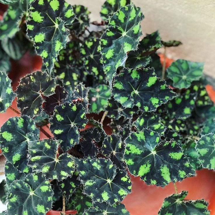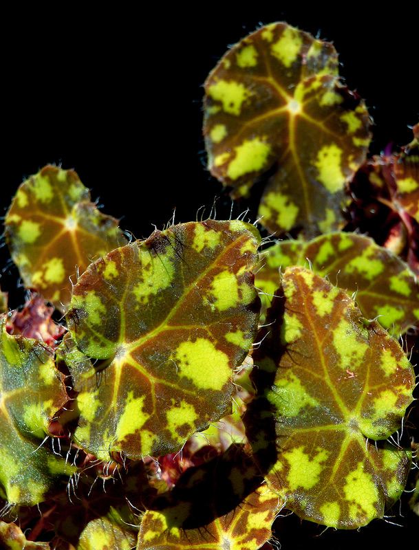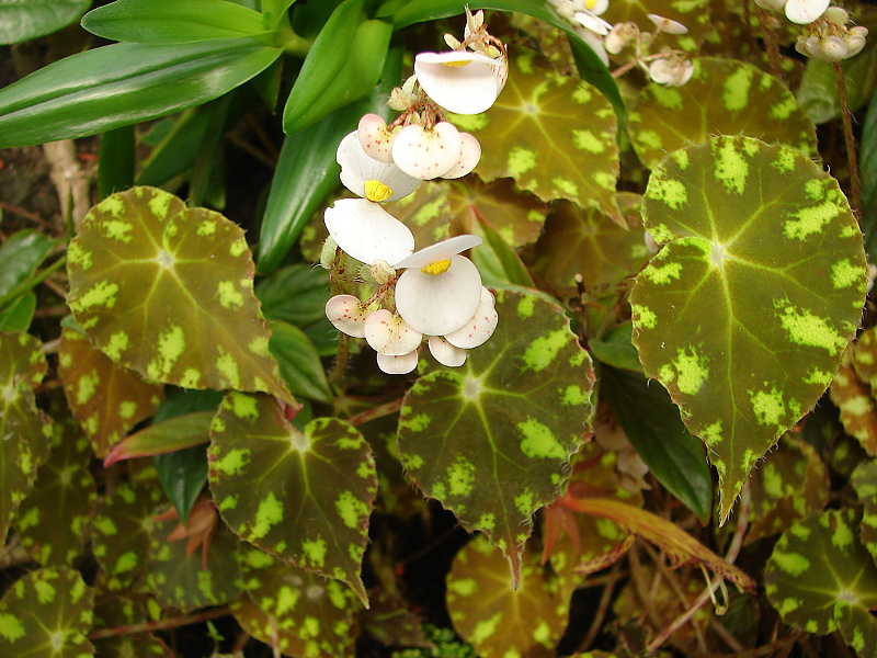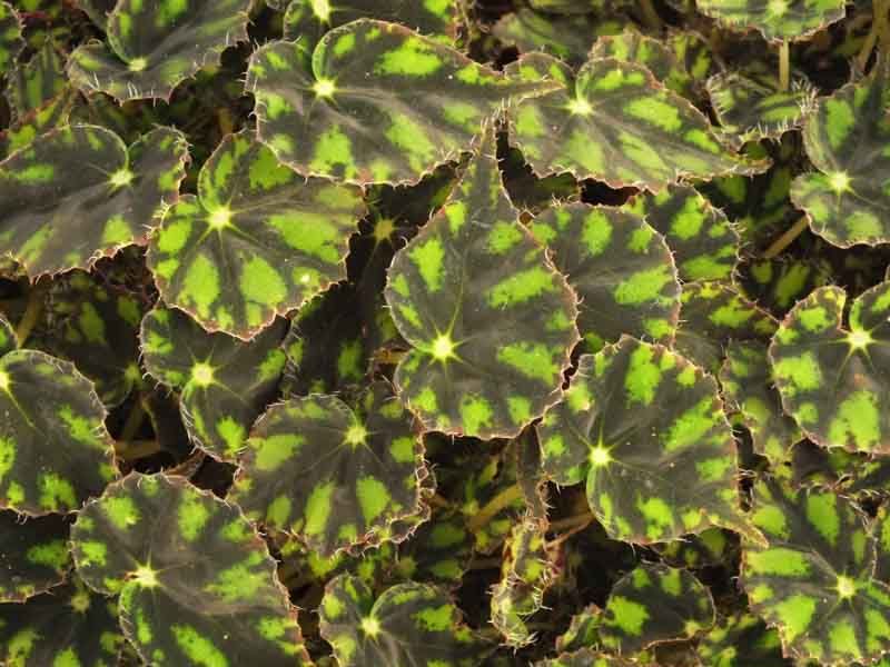 Бегония Боуэра cv. ‘Tiger’ имеет оливково-зеленые листья со светло-зелеными пятнами.