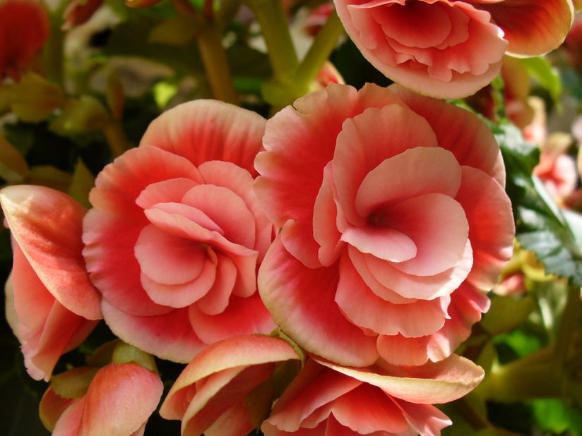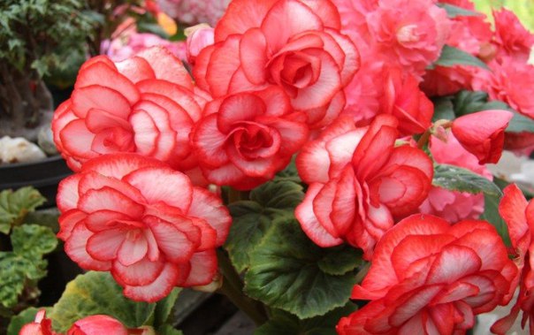 Светло-розовые цветки бегонии с красноватой каймой по краям лепесков