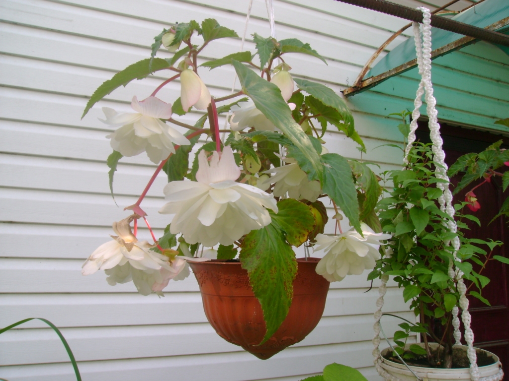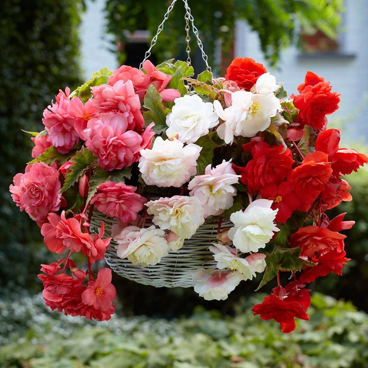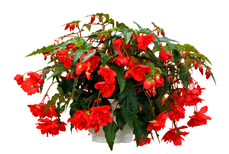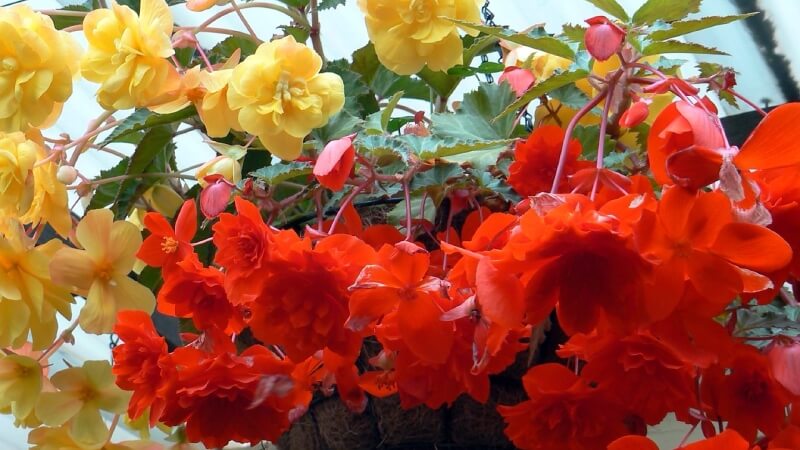 Длинные, струящиеся вниз побеги ампельной бегонии украшены множеством ярких, пышных цветов.