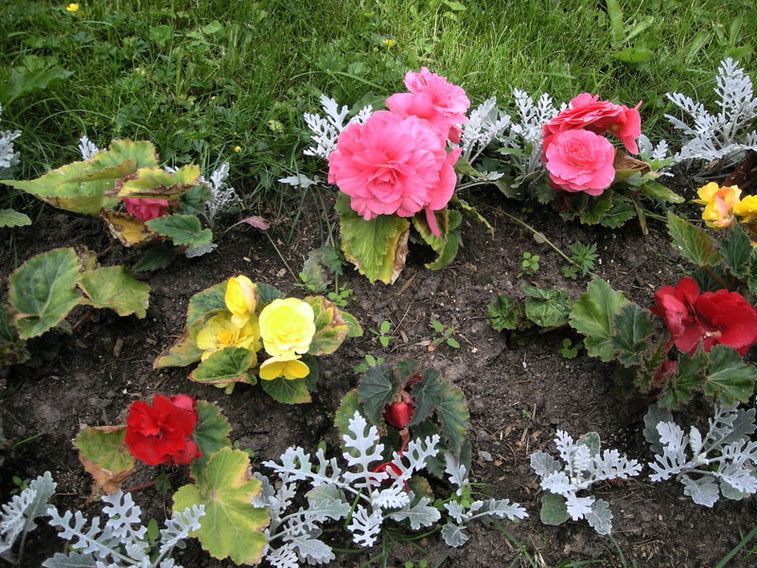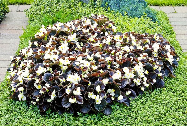 После 1,5-2 месяцев выращивания на подоконнике или тепличке саженцы бегонии можно высаживать в грунт. Очень красиво смотрятся узоры из однотипных бутонов – посмотрите на фото идеи для сада.При высадке важно придерживаться правила – между растениями не больше 20 см. Тогда в скором времени кустики накроют весь грунт, и вы получите сплошной цветущий ковер.