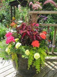 В старом глиняном контейнере изображен лосось SunPatiens Spreading Salmon, бегония Bonfire, скевола Blue Princess и японский сладкий флаг Ogon. (Норман Винтер / Служба поддержки МГУ / MCT)
