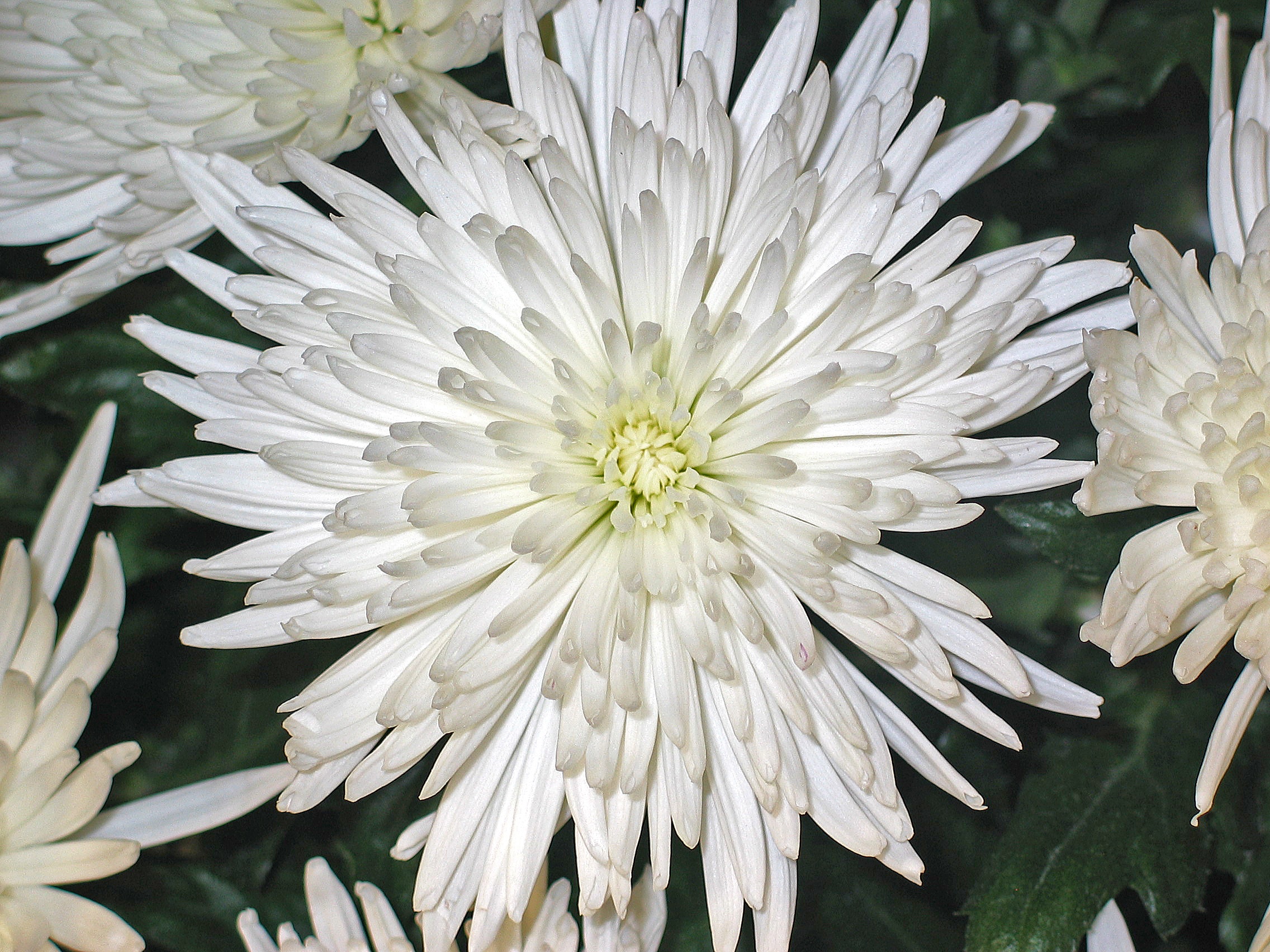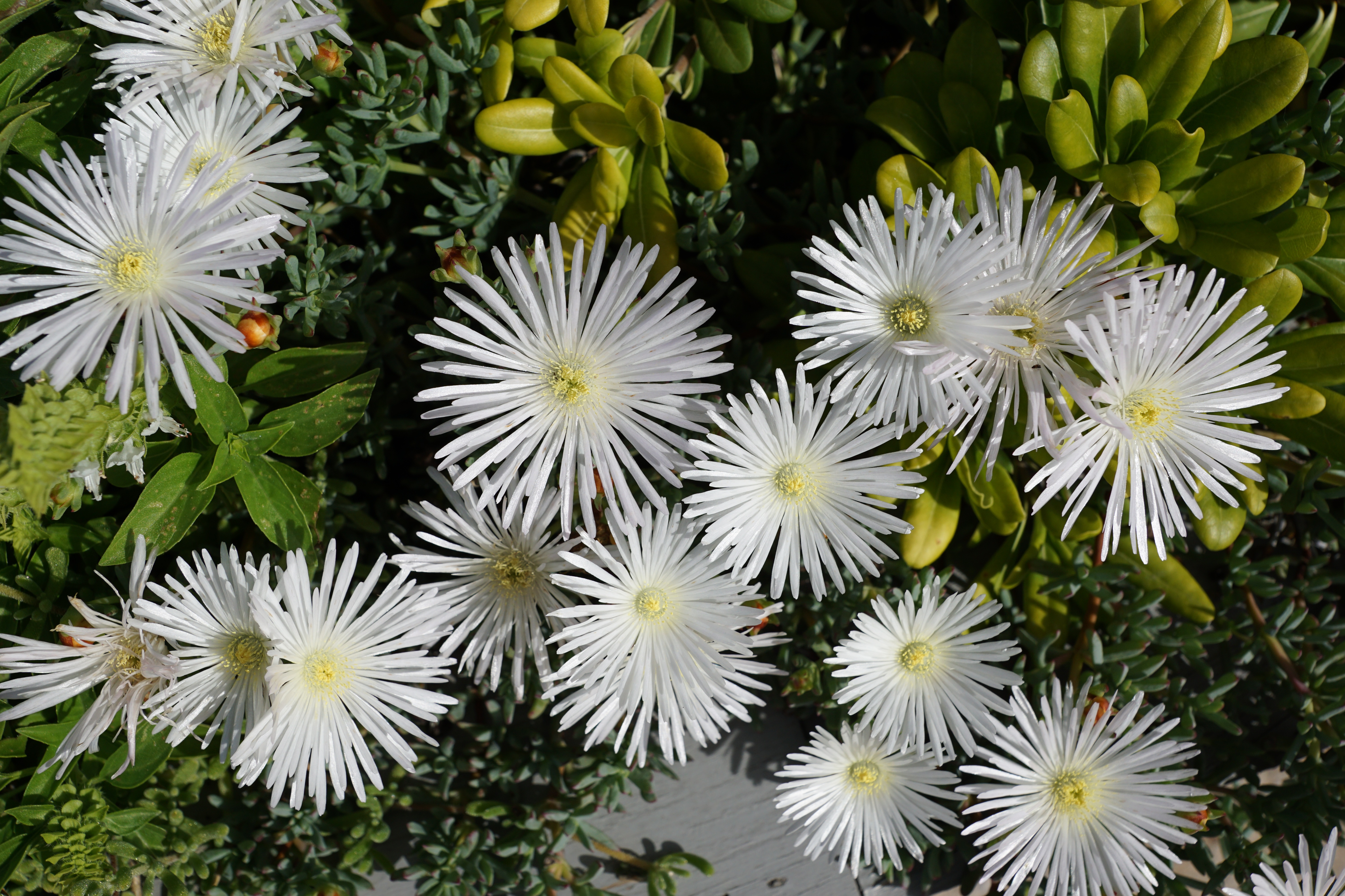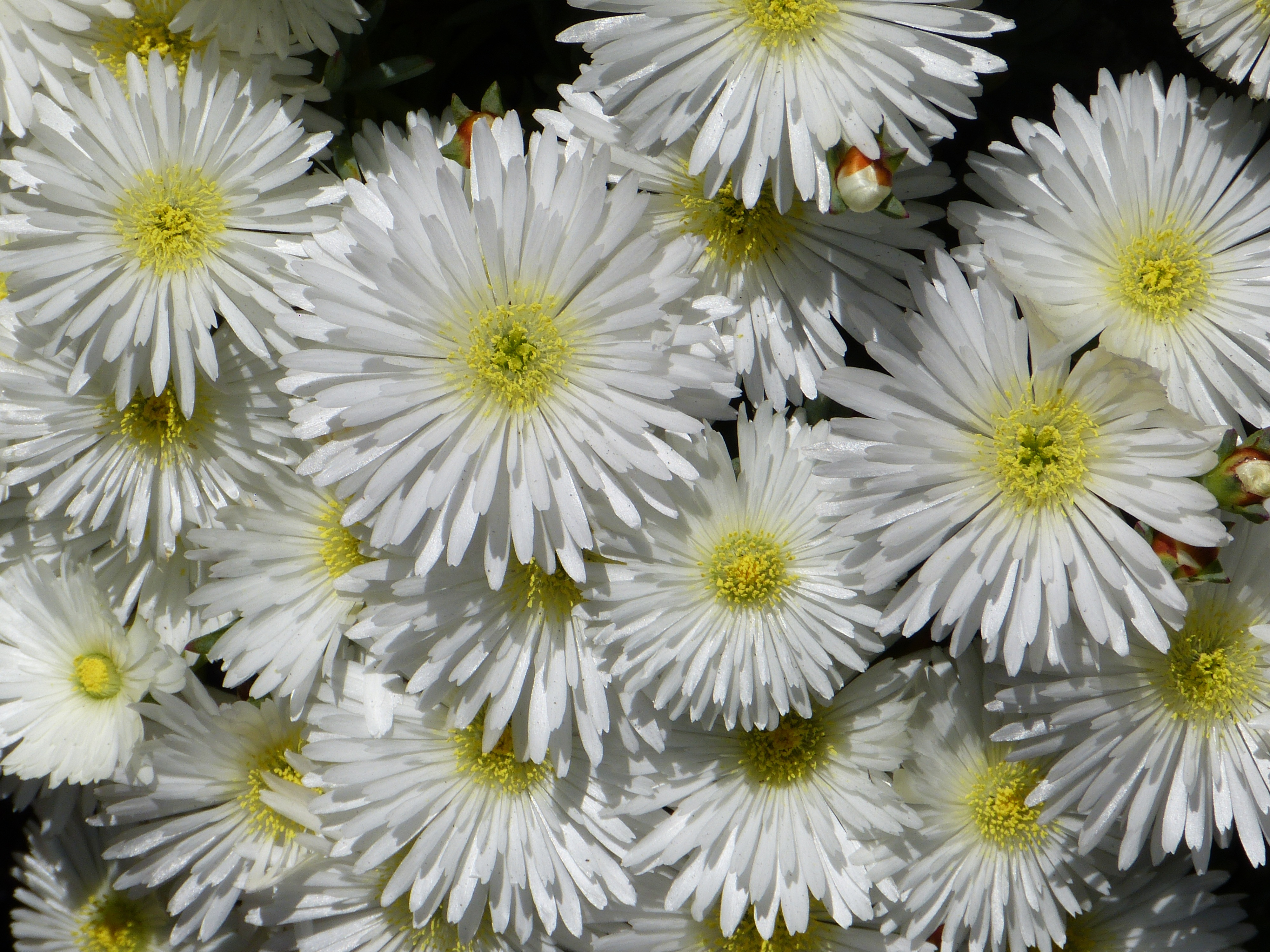 Цветки луча имеют широко расставленные ленточные язычки, обычно белые, около дюйма в длину и 1/16 дюйма в ширину. Трубчатые дисковые цветки с желтыми 5-лопастными венчиками и желтыми тычинками, с возрастом становятся красноватыми. Цветочные головки расположены в удлиненной обертке в форме урны, состоящей из близко расположенных, остроугольных, 1/8 дюйма, шиловидных, перекрывающихся, жестких прицветников (филларии) в 4-6 неправильных слоях (сериях). Филларии в нижней части прижаты, а в верхней — расширены вверх. Обертки такие же средне-зеленые, как листья, но с более светлыми зелеными основаниями из-за роста прицветников.Цветоножки, образуемые игольчатыми прицветниками, имеют длину не более дюйма. Удлиненные нижние завязи лучевых и дисковых цветков на верхних концах имеют щетинистые образования (хохолок). Белые цветы лучевых цветов и желтые дисковые цветы имеют раздвоенные рыльца.