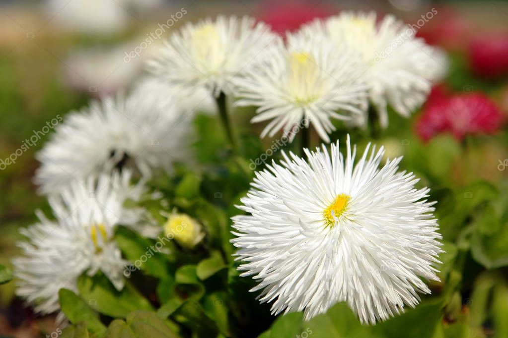 Куст ее компактный, плотный, прямостоячий, высота его варьируется в зависимости от сорта и составляет от 15 до 50 см. Стебли и листья растения слегка опушены, цветки диаметром 4-7 см собраны в одиночные соцветия. Цвета – белый, розовый, сиреневый, сердцевина ярко-желтая.