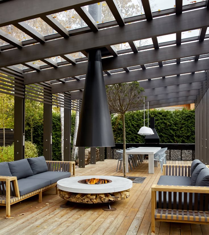 Дизайнер Илья Верин использовал в дизайне этой беседки красивые сочетания природных материалов — дерева и камня. Дерево и камень на площадке для мангала.