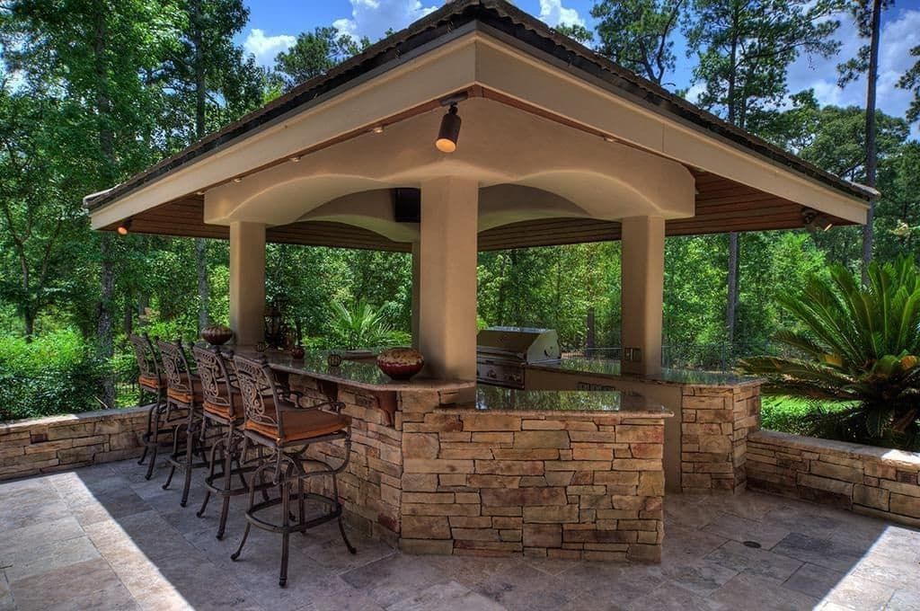 Идея дизайна: большая беседка во дворе частного дома на заднем дворе в современном стиле с летней кухней и покрытием из каменной брусчатки