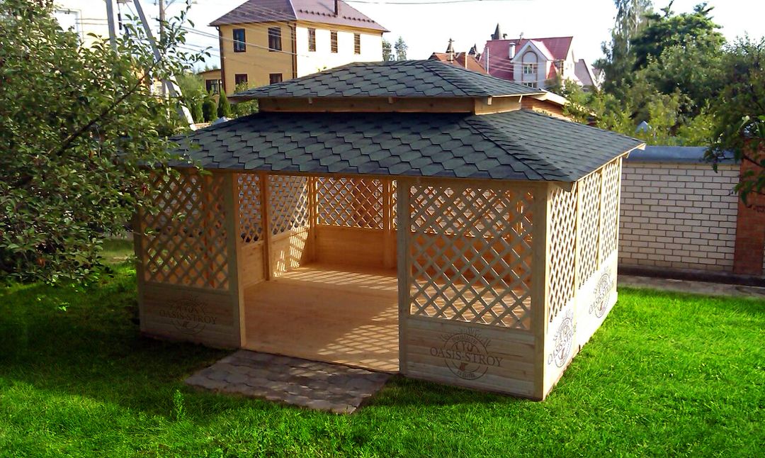 Вот на фото ниже мы видим классическую беседку этого типа. Она стоит на 6 столбах. Стенки беседки закрыты решетчатыми панелями из реек, набитых диагонально крест на крест. Такие панели легко сделать самому — отмеряй, режь, да приколачивай.